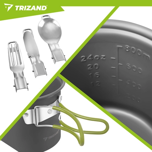 Le set comprend un couvert pliable en acier inoxydable (cuillère, couteau, fourchette), une pochette textile et un sac en filet pour un rangement ordonné. La mesure en millilitres facilite une cuisson précise et, grâce aux deux récipients, il est possible de préparer deux plats en même temps. Le set est sûr pour le contact alimentaire (LFGB) et convient à une utilisation sur un réchaud à gaz, une plaque électrique et un brûleur outdoor.