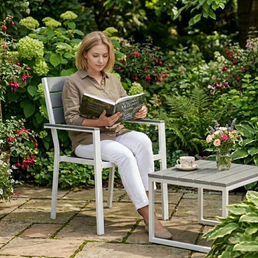 La combinaison élégante gris‑blanc et la texture HDPE inspirée du bois créent un design épuré et moderne qui s’harmonise facilement avec le reste du mobilier.