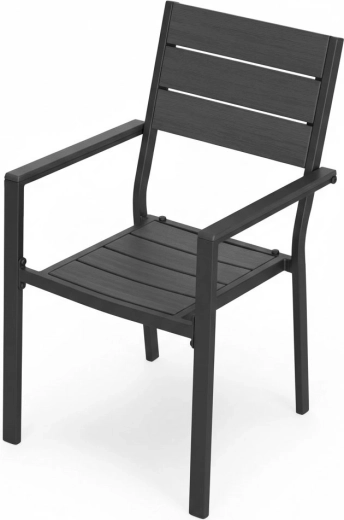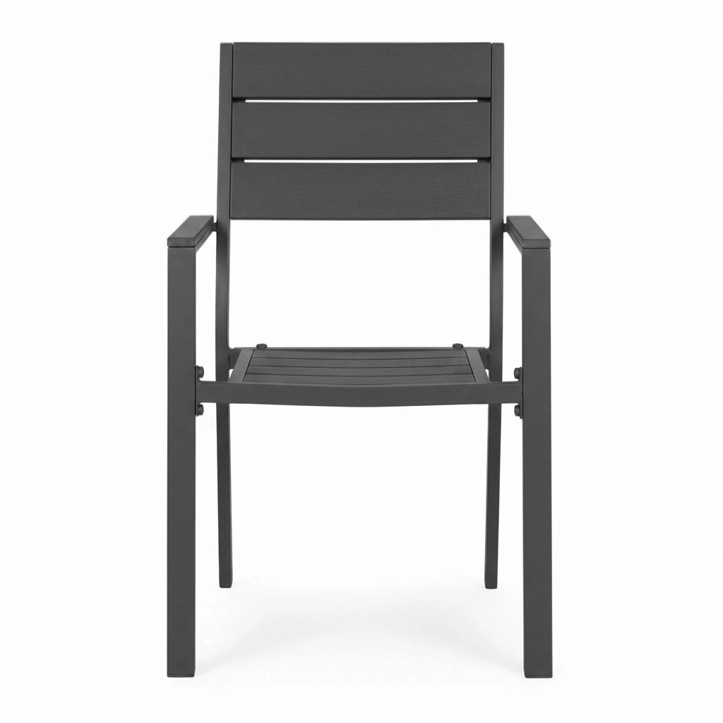 La structure en acier peint par poudrage est robuste et résistante à la corrosion, tandis que l’assise et le dossier en HDPE assurent confort, nettoyage facile et évacuation rapide de l’eau après la pluie. Une base stable, une assise large et des accoudoirs droits favorisent une assise agréable même lors d’une utilisation prolongée.