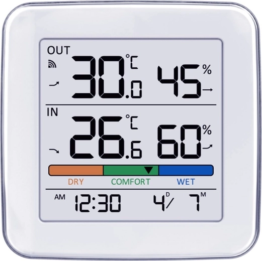 Le grand écran LCD affiche simultanément la température et l’humidité intérieures et extérieures, complétées par une échelle de confort en couleur pour une évaluation rapide de l’environnement.