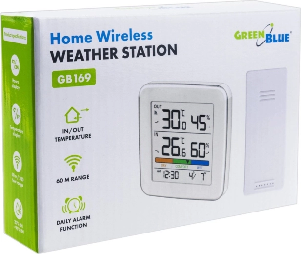 GREENBLUE GB169 est une station météo compacte et élégante pour le contrôle quotidien du climat. Son grand écran affiche simultanément la température intérieure et extérieure, l'humidité, l'heure et la date, complétés par un indicateur de confort coloré (Dry/Comfort/Wet) pour une évaluation rapide de l’environnement.