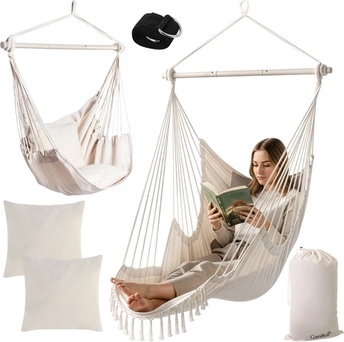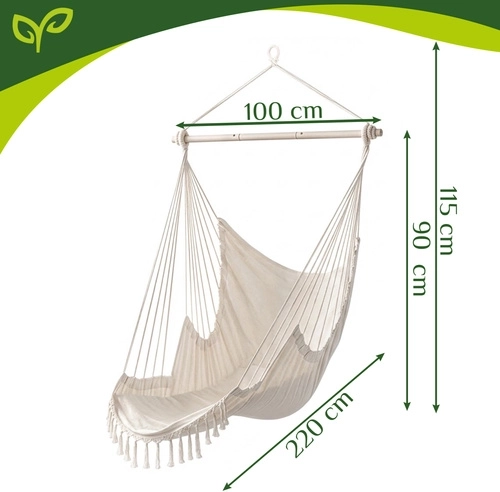 - Fauteuil suspendu, 2 coussins, barre d’écartement, sangle de suspension, sac de rangement, notice