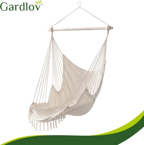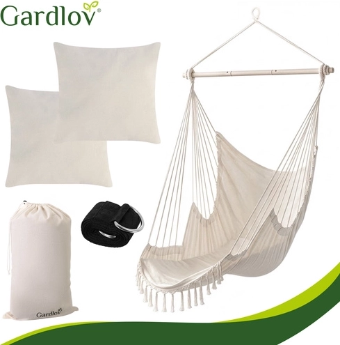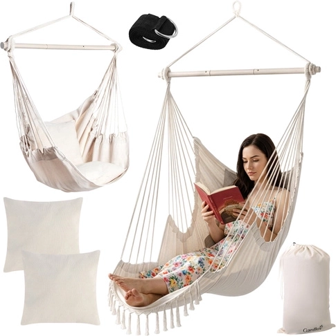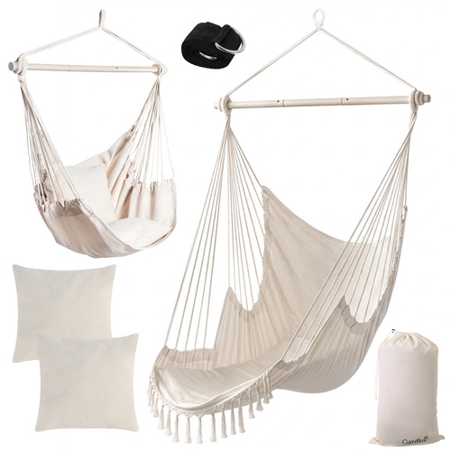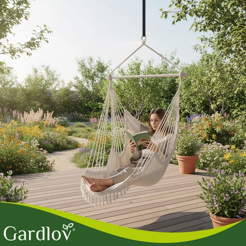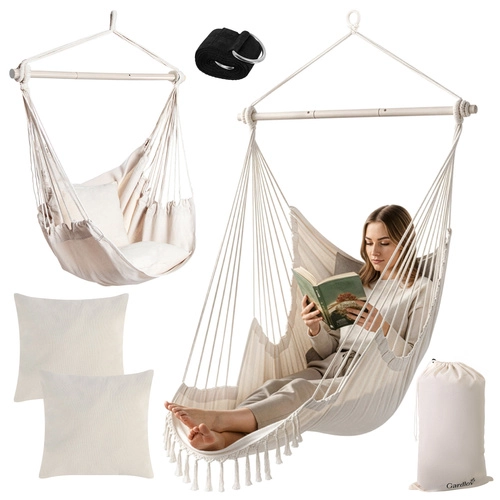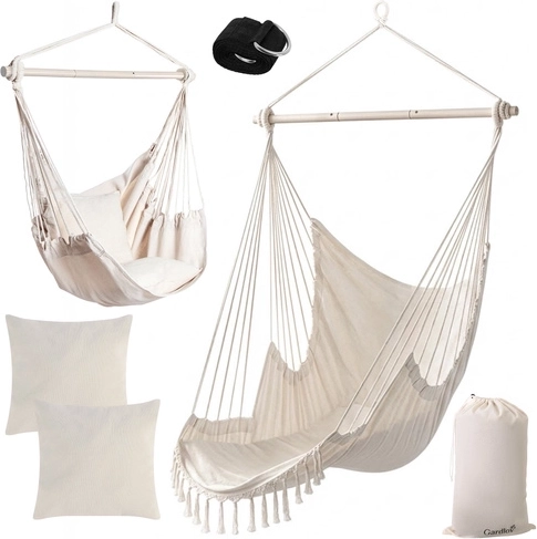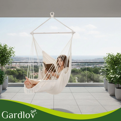 Le fauteuil suspendu GARDLOV spacieux et confortable transforme balcon, terrasse et salon en coin cocooning pour se détendre. Tissu en coton résistant 320 g/m², charge maximale 150 kg, barre d’écartement stable et 2 coussins moelleux pour une oscillation sûre et confortable. Structure légère avec sac de transport pour un déplacement aisé et entretien facile, lavable à 30 °C.