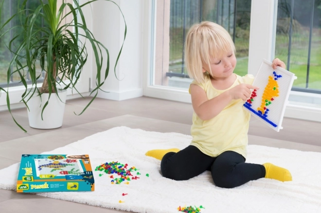 La mosaïque LENA avec 100 chevilles colorées est un excellent choix pour des activités créatives à la maison comme à la maternelle. Grâce au système simple d’insertion des chevilles dans la plaque perforée, les enfants exercent leurs capacités de coordination et leur patience tout en créant leurs propres motifs – animaux, véhicules ou figures imaginaires.