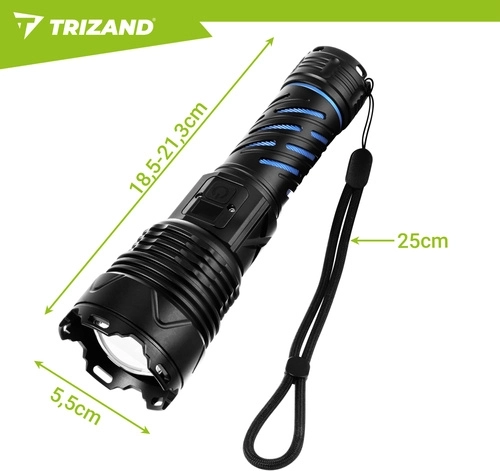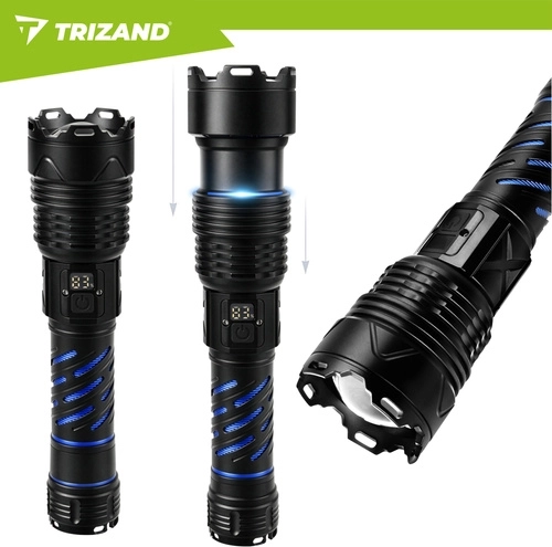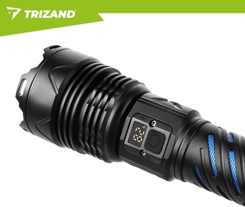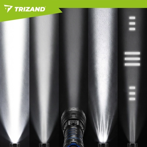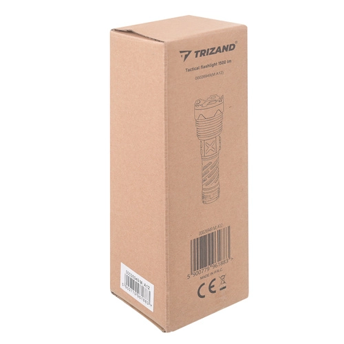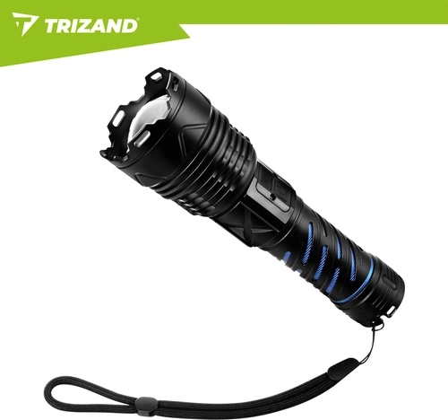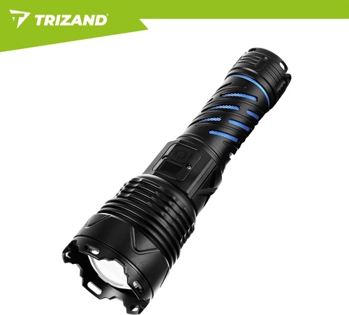 Puissante lampe torche tactique TRIZAND 1500 lm avec réglage du zoom, 5 modes d’éclairage et batterie intégrée 5000 mAh offrant une lumière fiable à la maison, en voiture et sur le terrain. Recharge via USB‑C, corps en aluminium résistant, écran numérique d’état de la batterie et fonction powerbank en font un compagnon fiable pour un usage quotidien comme pour les situations d’urgence.