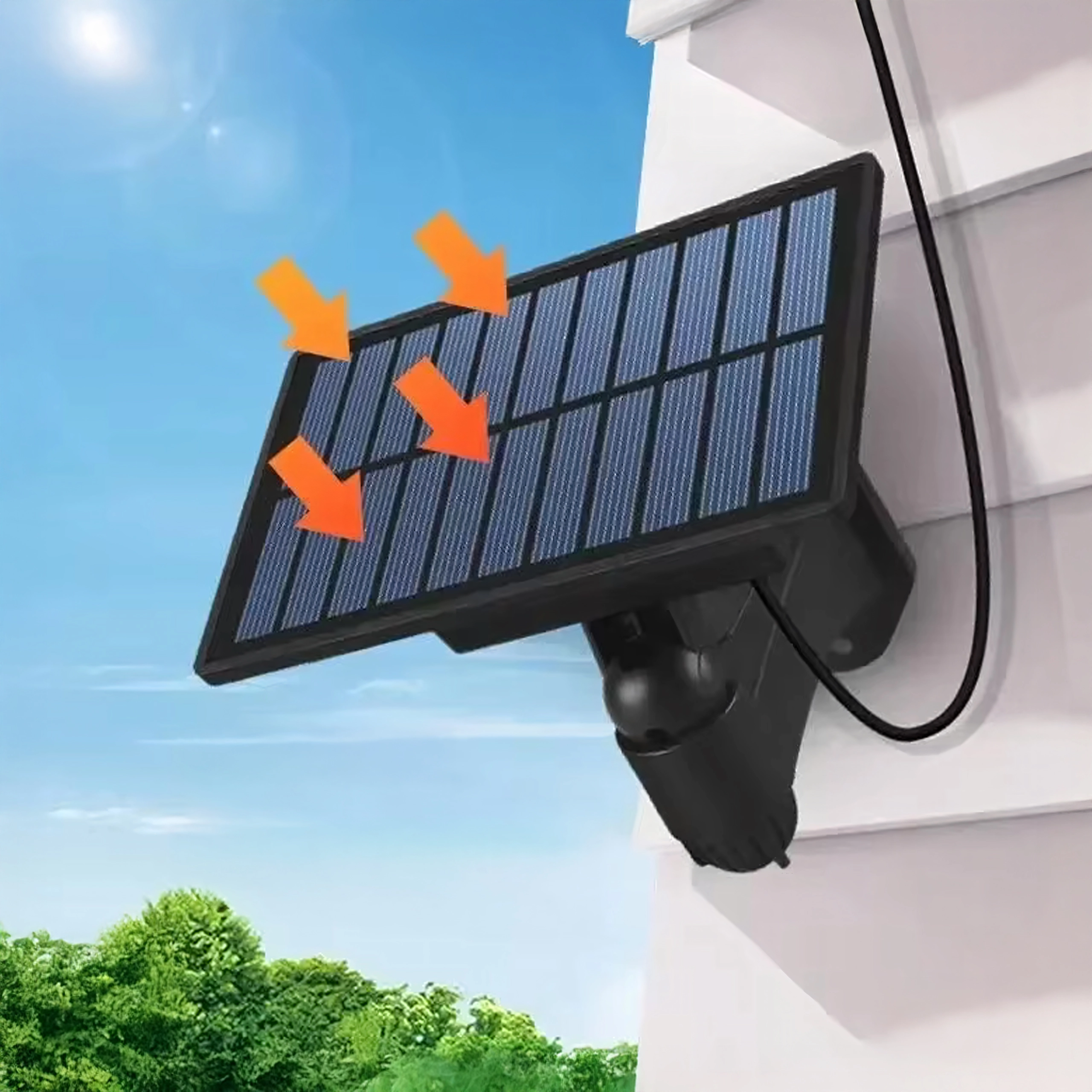 Le panneau séparé s’oriente facilement vers le soleil et se relie à la lampe par un câble. Le jour, la batterie se recharge, et à la tombée de la nuit, elle assure un éclairage fiable.