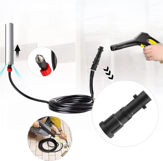 L’emballage comprend des adaptateurs interchangeables qui étendent la compatibilité avec différentes marques et types de nettoyeurs haute pression. Le tuyau est conçu pour franchir facilement les courbes et coudes des canalisations et, grâce aux buses arrière, décoller et entraîner les impuretés.