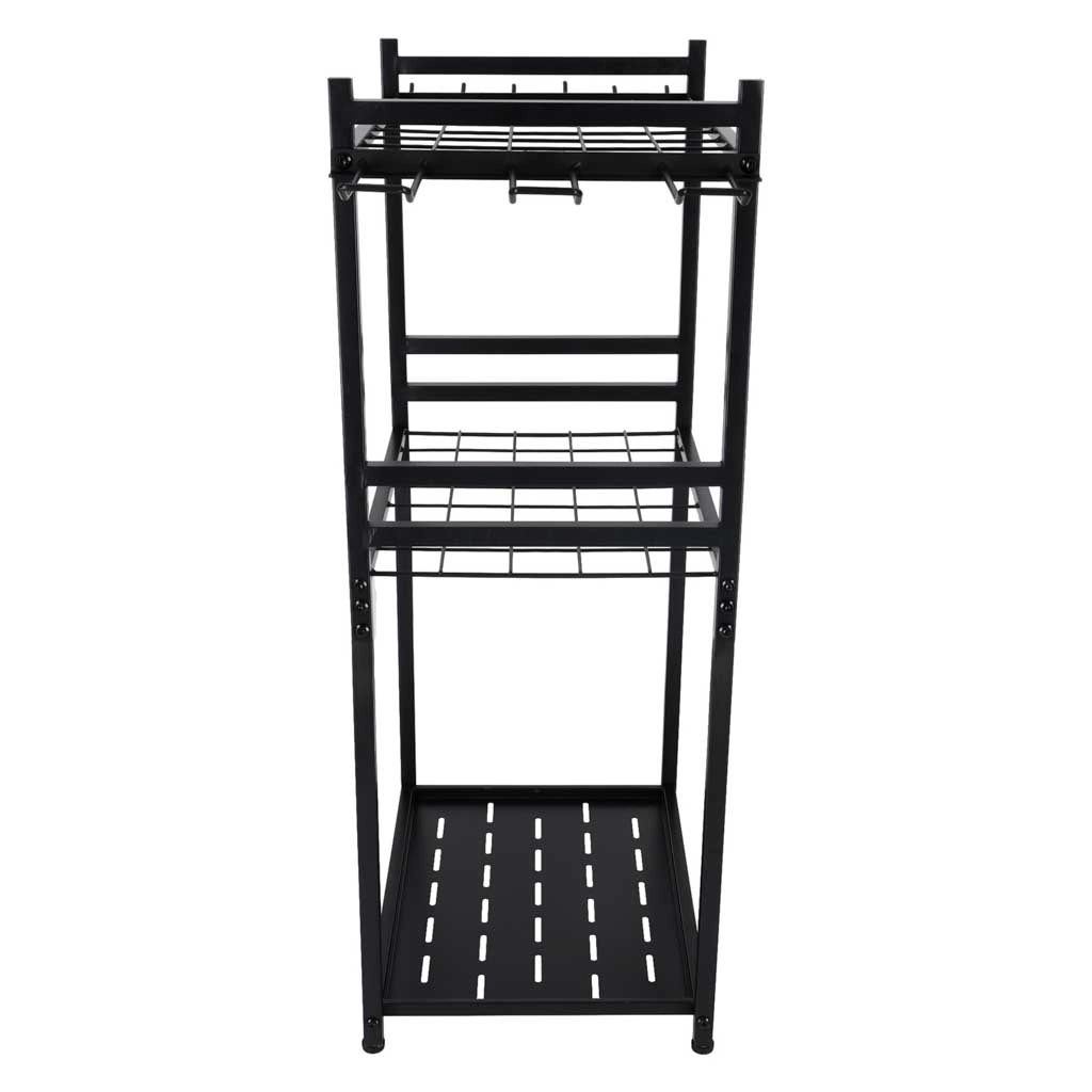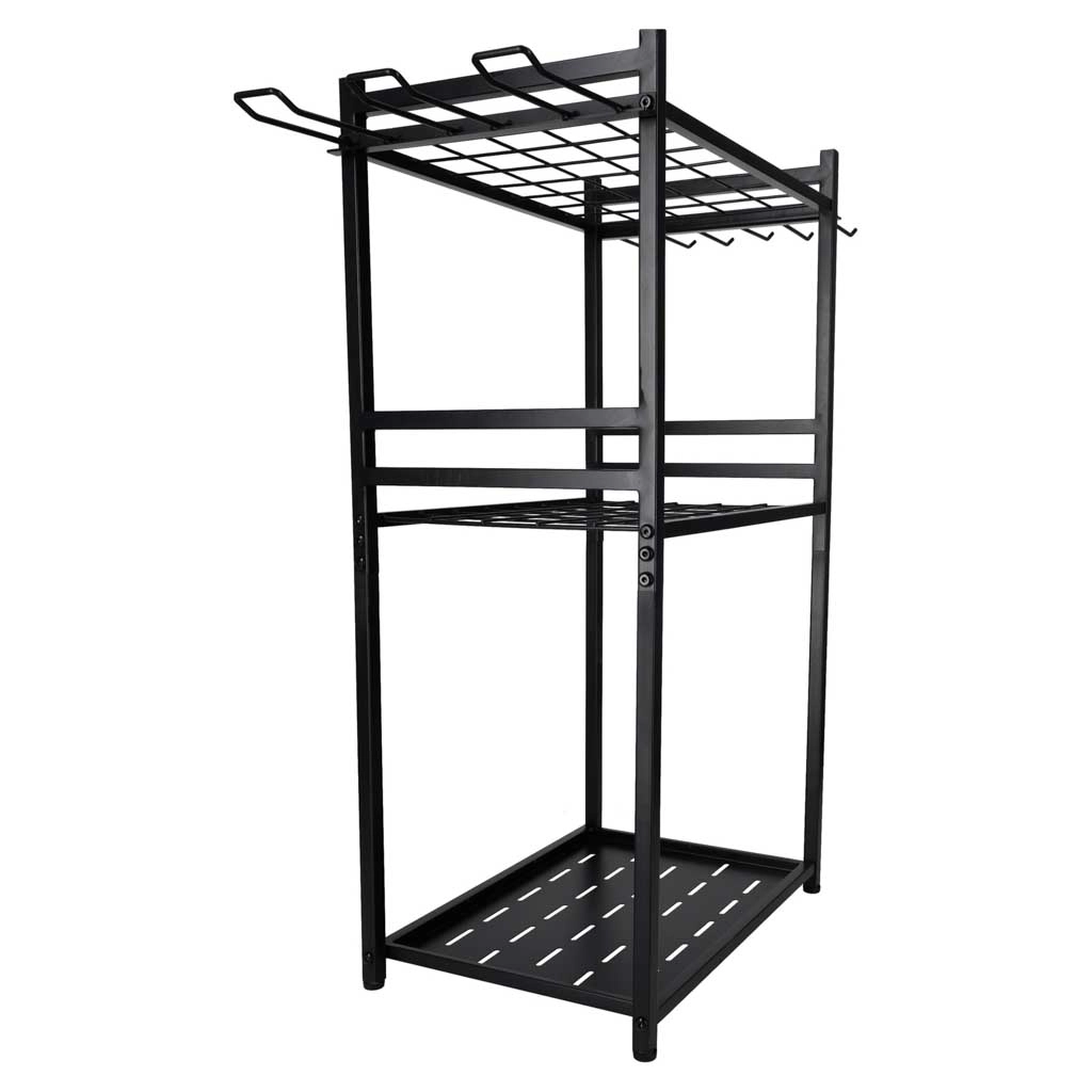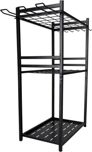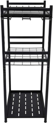 Le cadre en acier au carbone et les étagères ventilées supportent même les outils plus lourds sans vaciller. Le design ouvert favorise l’évacuation de l’eau et la circulation de l’air.