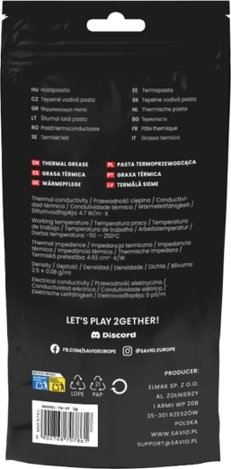 SAVIO TG-01 est une pâte thermique de qualité avec des microparticules de carbone qui comblent parfaitement les micro‑irrégularités entre l’IHS du processeur et la base du dissipateur. Elle permet ainsi d’atteindre des températures stables et contribue à maintenir un fonctionnement du PC à la fois silencieux et performant.