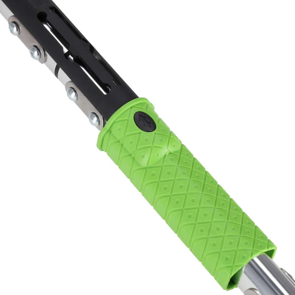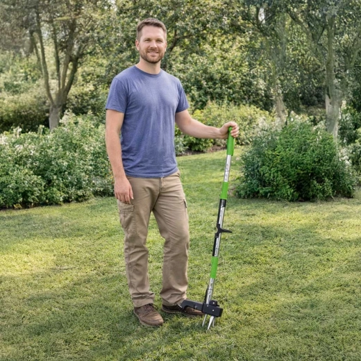 Le long manche télescopique et le levier près de la tête permettent de travailler debout, en préservant le dos et les genoux. Idéal pour de longues sessions sur la pelouse comme sur les massifs.