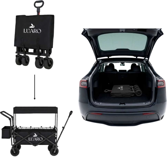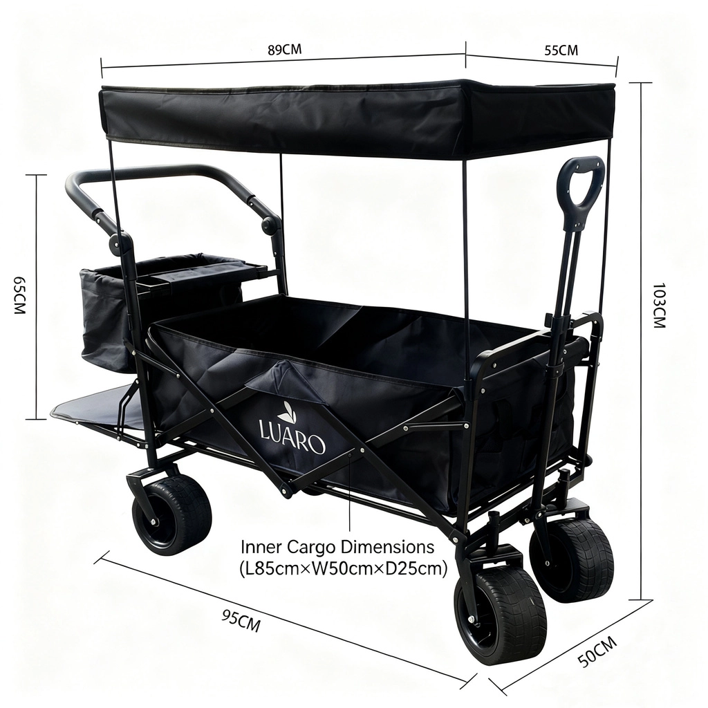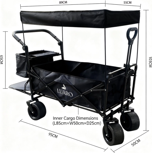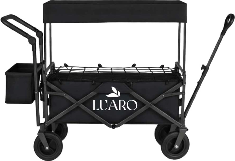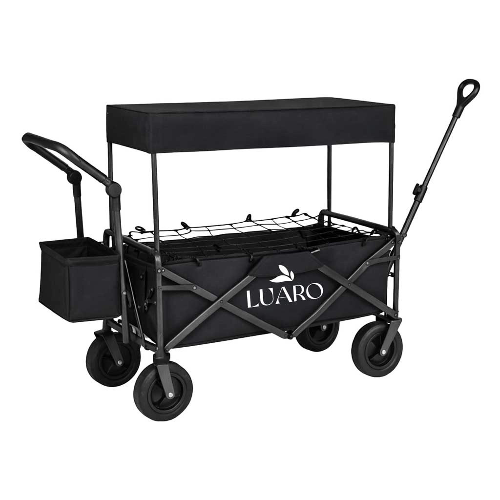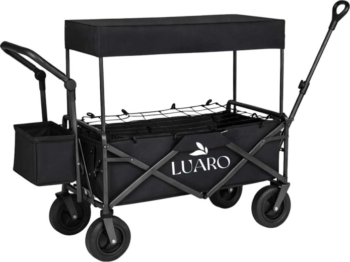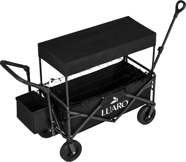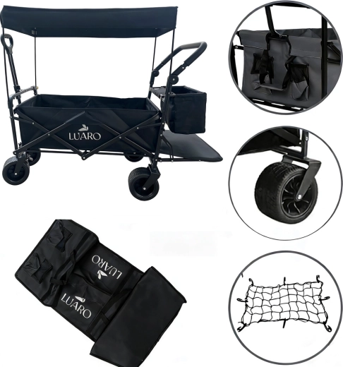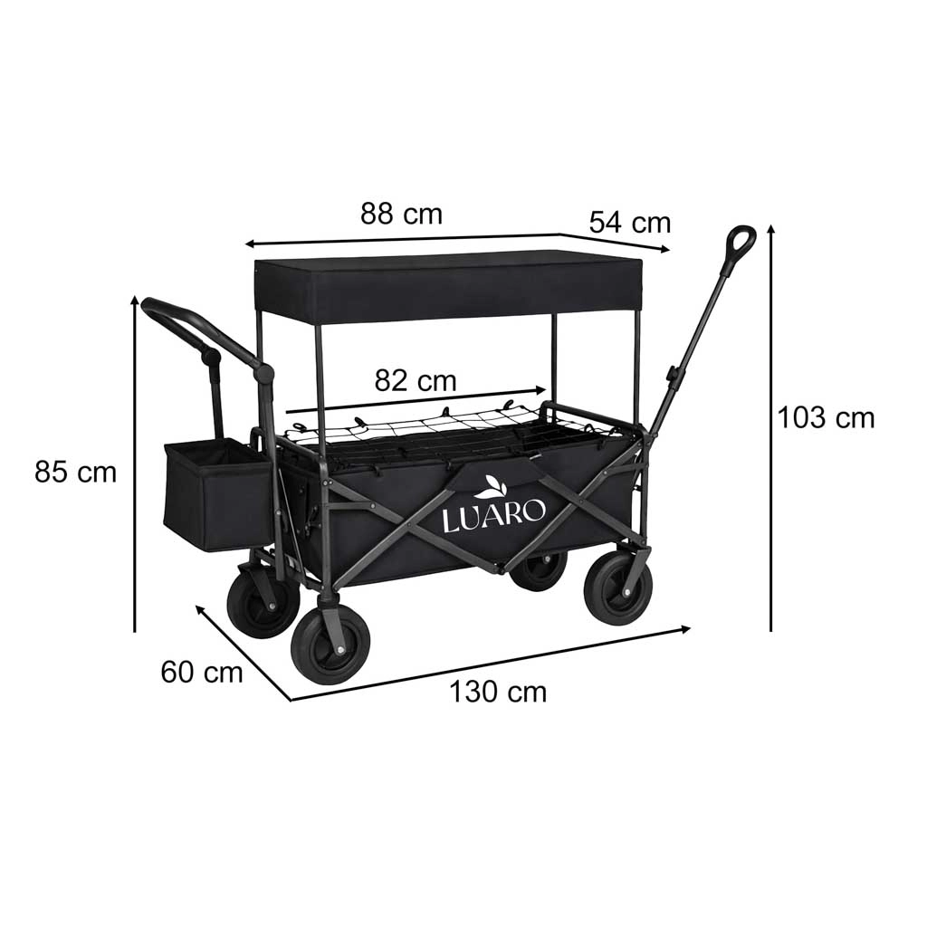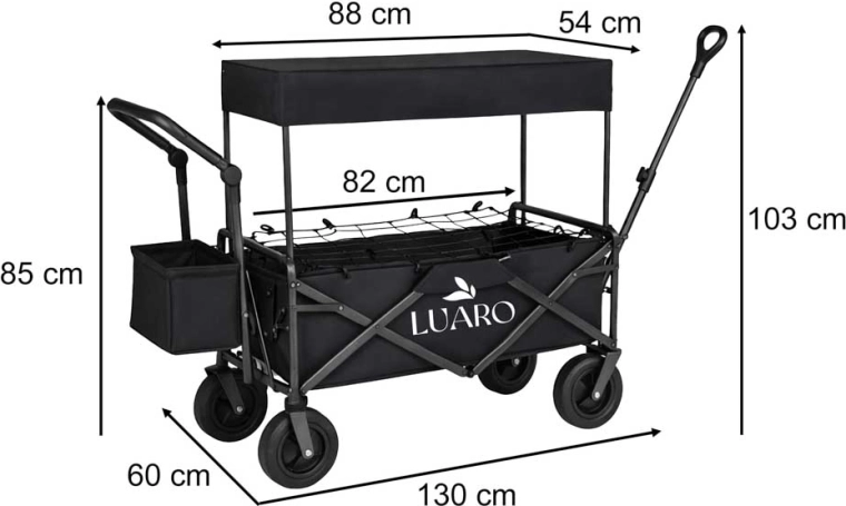Le chariot pliable LUARO avec auvent est idéal pour la plage, le camping et le jardin. Il offre un grand volume, une structure en acier robuste, de larges roues tout-terrain et une manipulation confortable grâce à une poignée télescopique pour tirer et une poignée arrière pour pousser. Sont inclus un auvent de protection amovible, un filet de maintien de charge et un sac latéral additionnel pour une meilleure organisation.