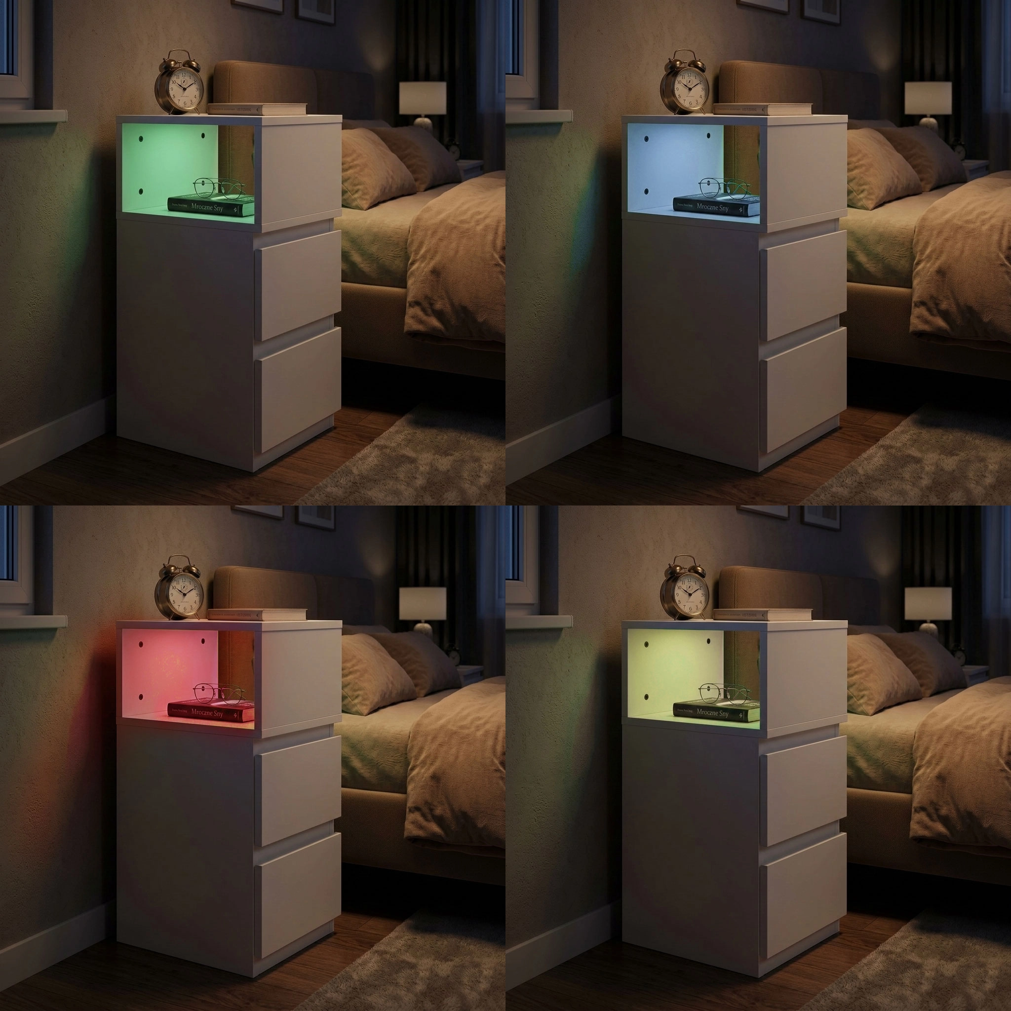 Sublimez l’atmosphère de votre chambre avec la table de chevet élégante ModernHome. L’éclairage LED RGB intégré dans le compartiment ouvert favorise la détente pour la lecture ou le soir. Le contrôle est simple : à l’aide de la télécommande, choisissez parmi 16 couleurs et effets (Flash, Strobe, Fade, Smooth), tandis que l’application mobile propose une palette encore plus étendue et un réglage progressif de la luminosité.