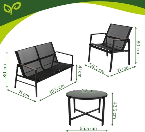 Ensemble élégant et pratique pour balcon, terrasse ou jardin – idéal pour le café du matin, les soirées détendues et un repos confortable. Les assises respirantes en Teslin assurent le confort même par temps chaud, tandis que l’acier galvanisé garantit une longue durée de vie en extérieur. Les décors bois sur les accoudoirs apportent du style sans entretien exigeant.