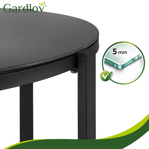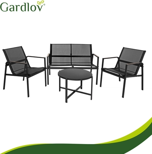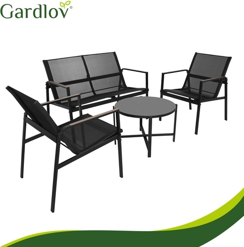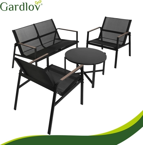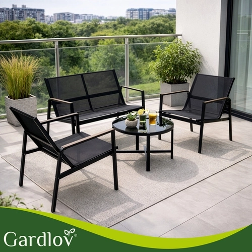 Créez en un instant une zone conviviale sur votre balcon ou terrasse. Ensemble GARDLOV 4 en 1 comprenant un canapé, deux fauteuils et une table basse avec plateau en verre trempé. Grâce à la structure en acier (galvanisé) et au tissu respirant Teslin, l’ensemble est stable, résistant aux intempéries et facile à entretenir – il suffit d’essuyer avec un chiffon humide.