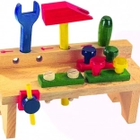 - Tournevis, marteau, clé, écrous, vis, établi en bois