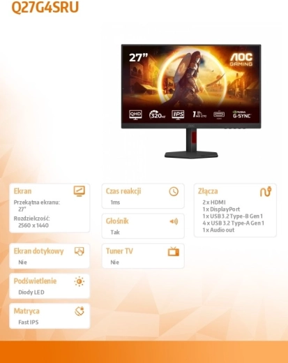AOC 27" écran de jeu Q27G4SRU Fast IPS 320 Hz, QHD, HDMI/DP, pivot, haut-parleurs