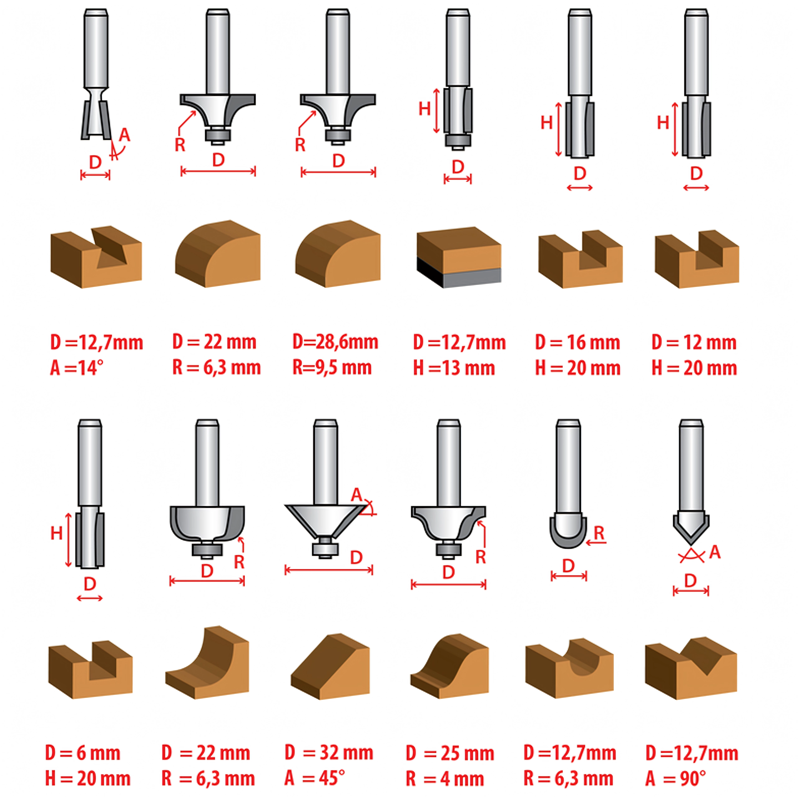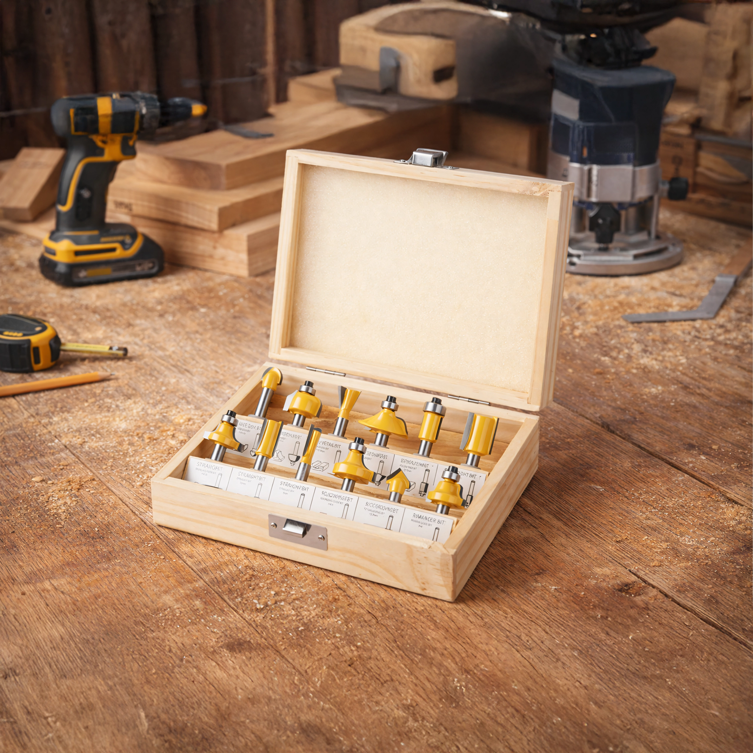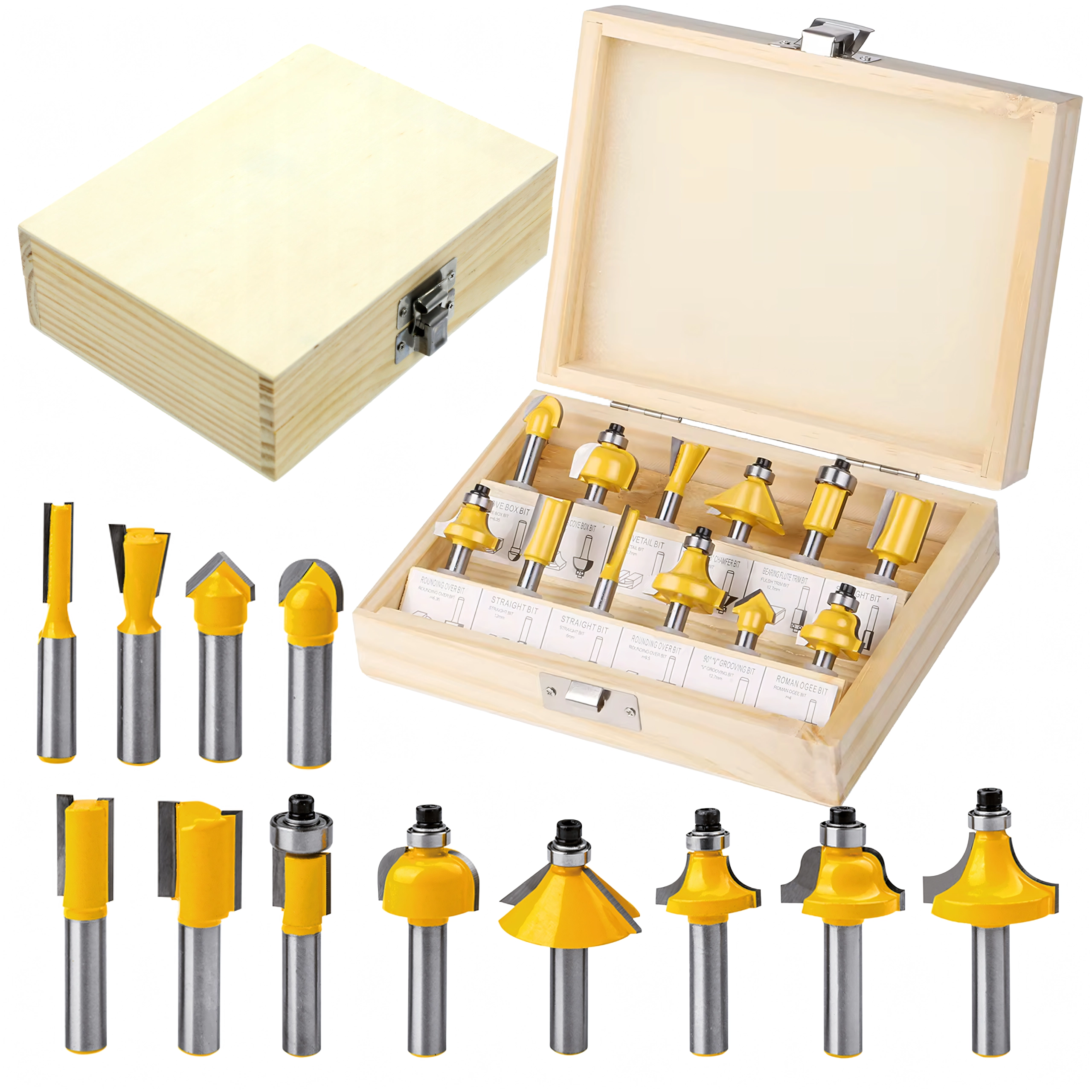 Le set couvre les opérations de menuiserie les plus courantes : arasage, profilage des chants, rainurage et coupes décoratives. Idéal pour le mobilier, les cadres, les moulures et les panneaux.