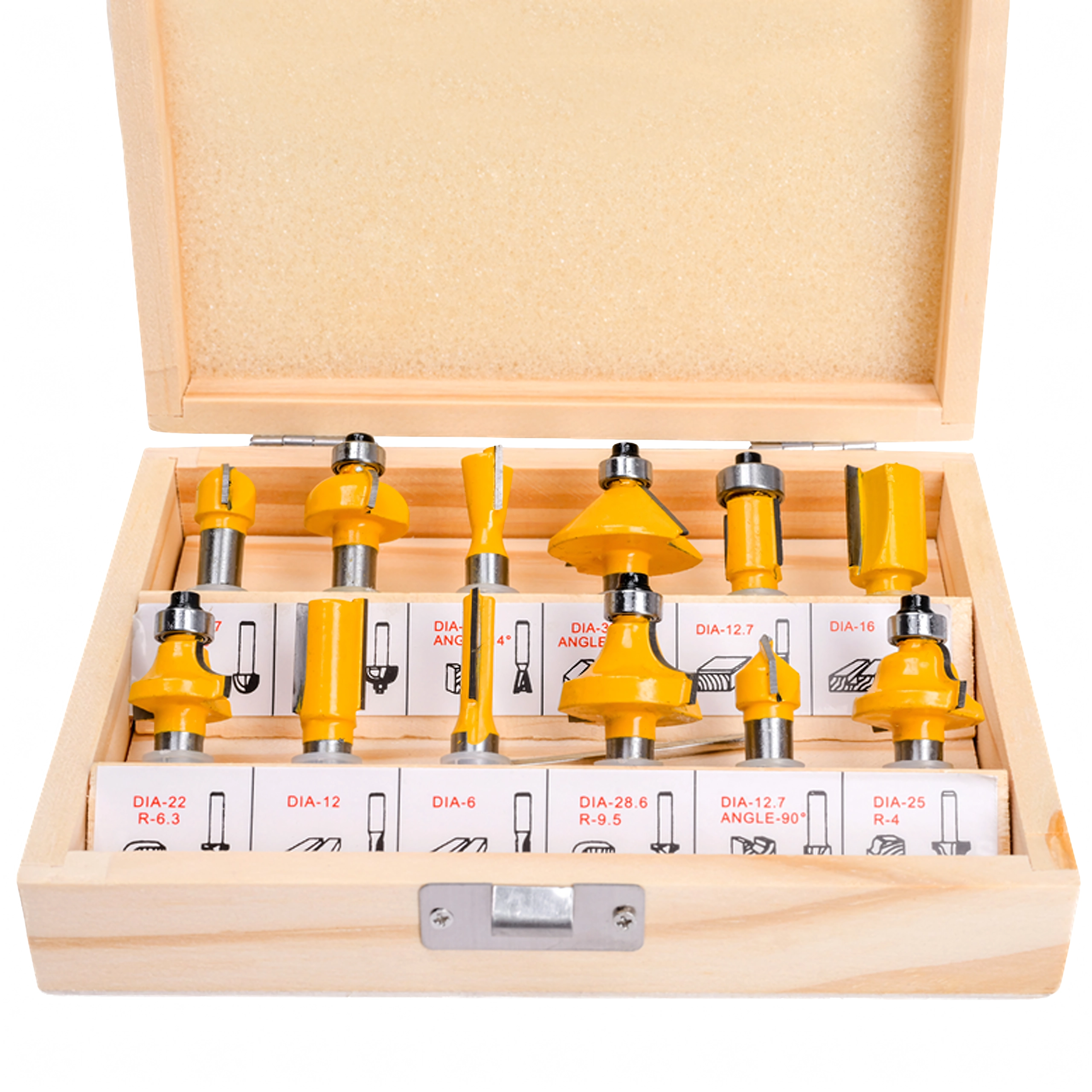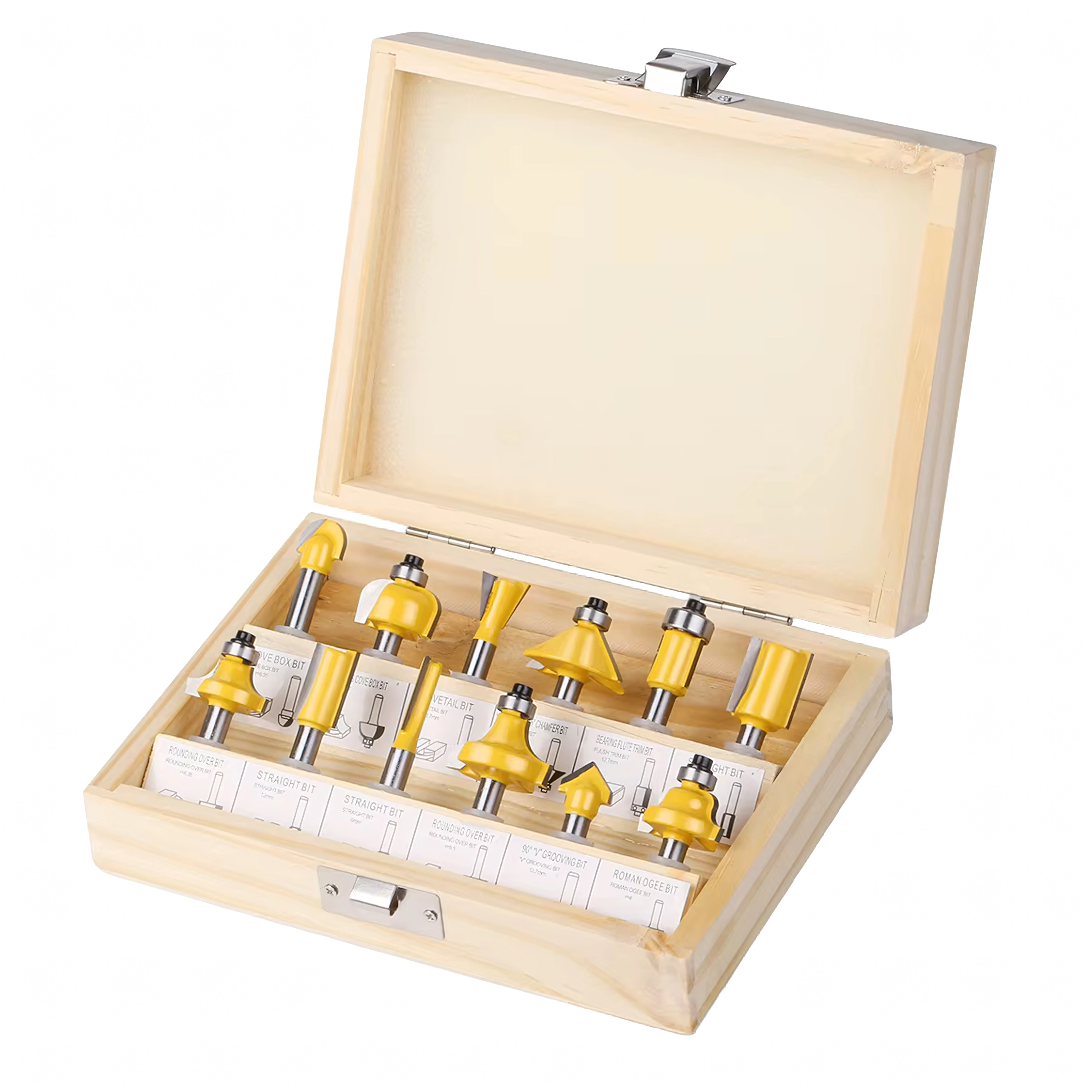 Ce set compact de 12 fraises profilées avec arêtes en carbure est conçu pour des coupes nettes et répétables. Il comprend les profils les plus utilisés pour le arrondi, le chanfrein, les rainures en V et le fraisage droit, afin de finir facilement les chants des pièces de mobilier, des cadres et des habillages.