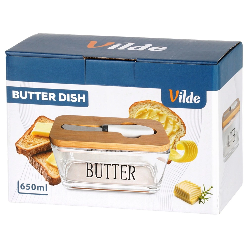 Beurrier élégant en verre avec couvercle en bambou et couteau à beurre intégré pour un rangement et un service pratiques. Verre transparent avec inscription BUTTER, capacité de 650 ml, dimensions 16,5 × 11,5 × 8 cm. La partie en verre passe au lave-vaisselle et convient au micro-ondes. Un accessoire stylé pour toute cuisine.