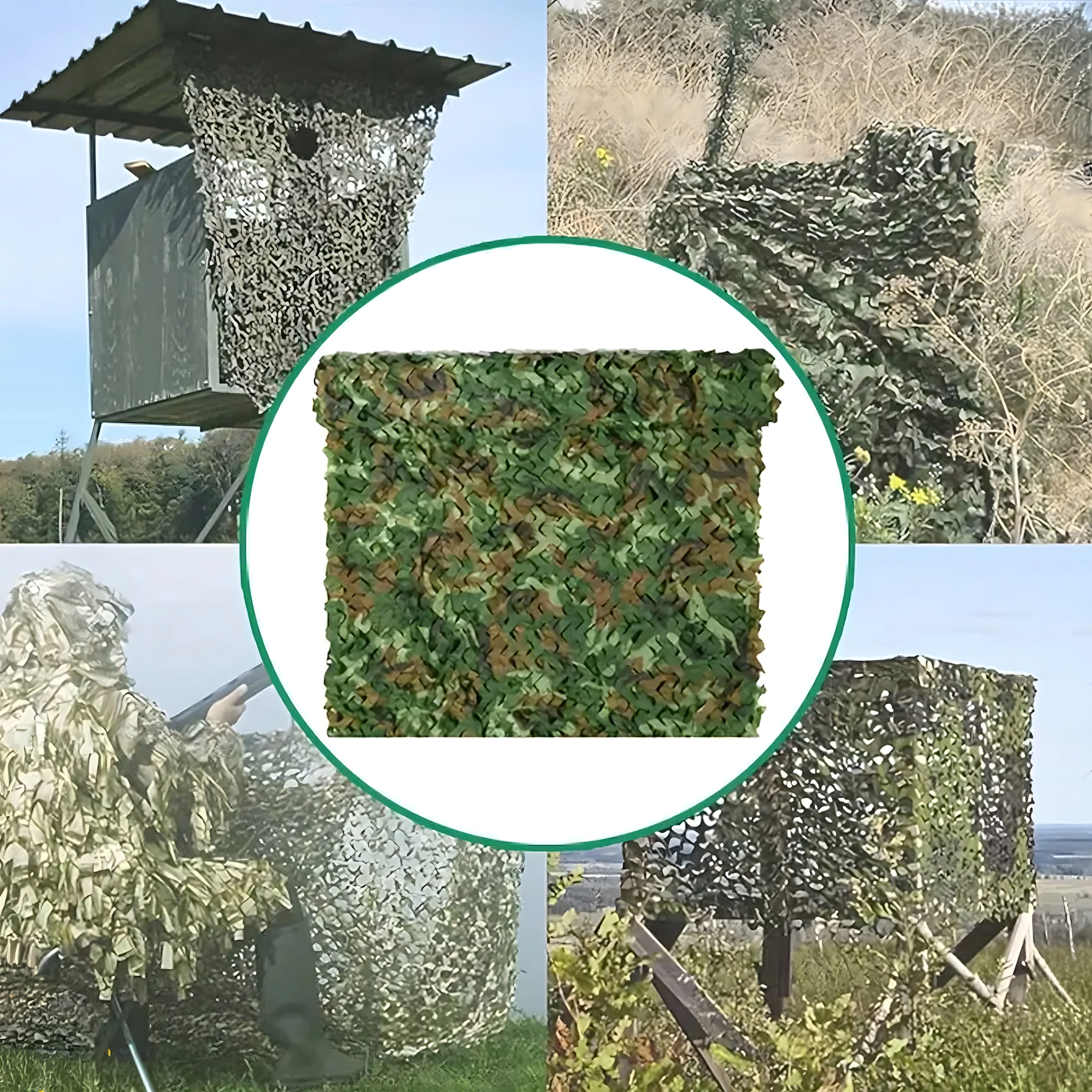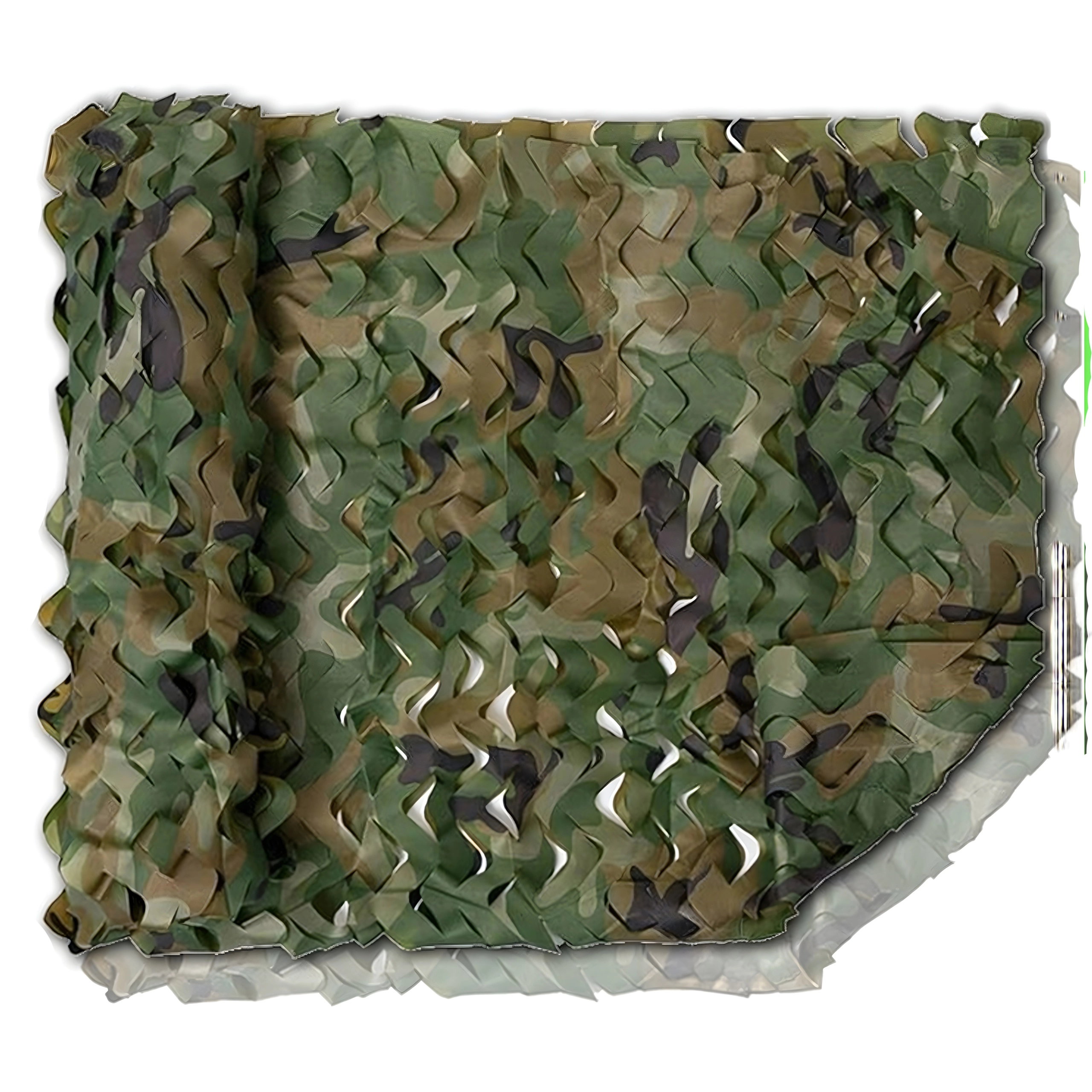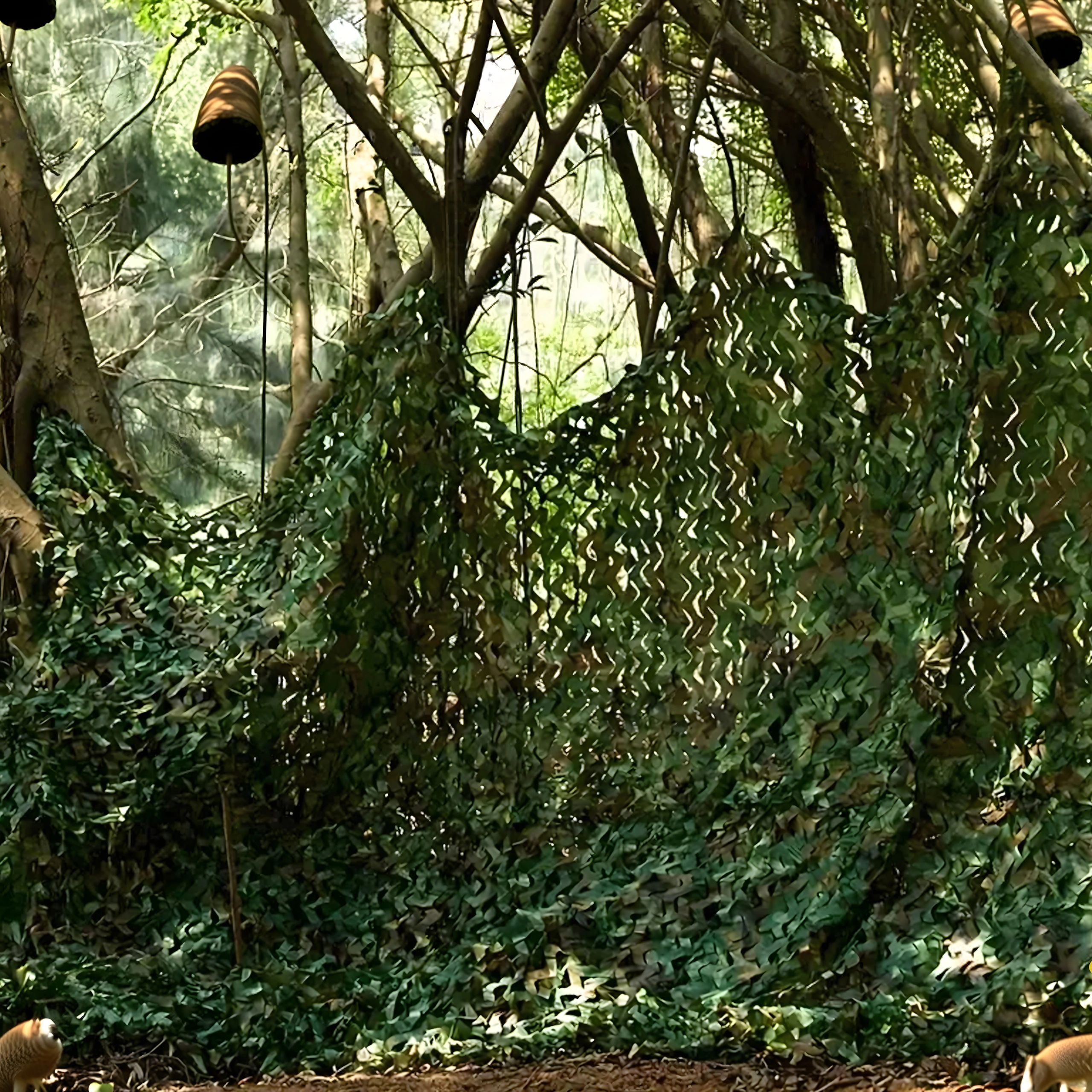 Les découpes feuillagées et le motif woodland moro brisent efficacement les contours et aident le filet à se fondre dans la végétation environnante. Idéal pour couvrir équipements, clôtures ou abris.
