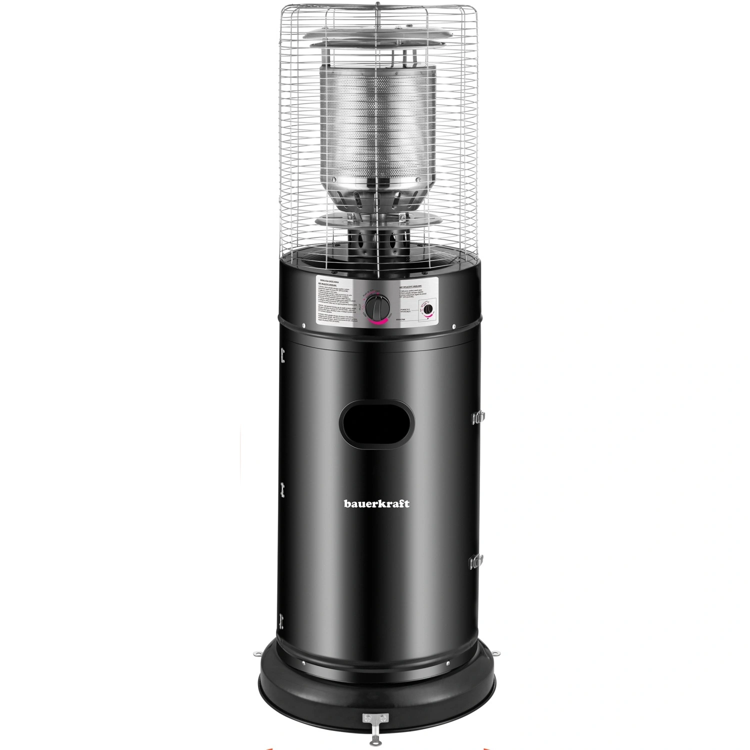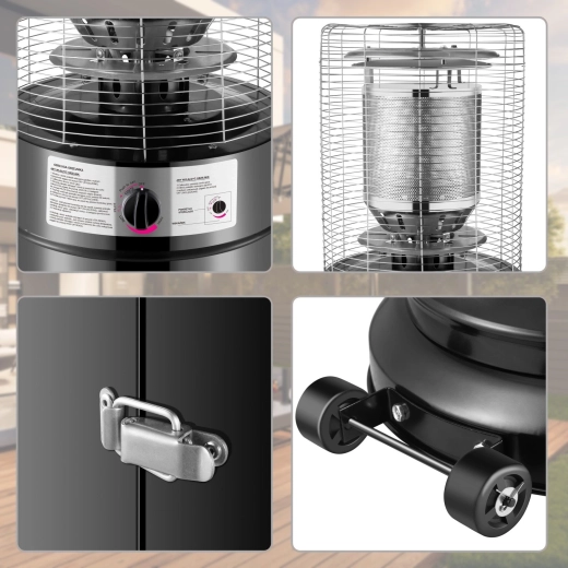 L’utilisation est intuitive : le réglage progressif de la puissance et l’allumage piézo fiable garantissent un démarrage rapide et un ajustement précis de la température. Le compartiment verrouillable pour bouteille jusqu’à 11 kg préserve l’esthétique tout en renforçant la sécurité. Les roulettes facilitent la manipulation et la housse fournie protège l’appareil de la pluie et de la poussière.