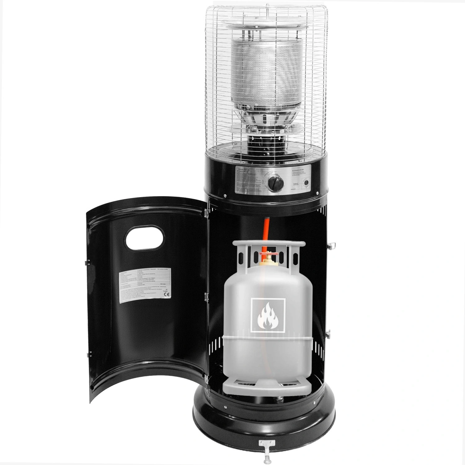 Compartiment verrouillable pour une bouteille de gaz jusqu’à 11 kg et roulettes intégrées pour déplacer facilement le chauffage selon les besoins.