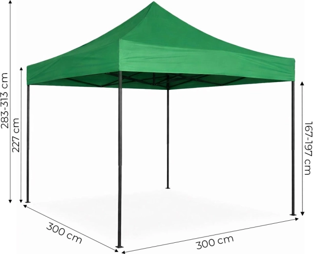 Les pieds réglables en hauteur sur 4 niveaux permettent d’adapter la hauteur de passage et la hauteur totale selon les conditions. Les pieds avec trous de fixation et les piquets et cordes fournis assurent la stabilité sur l’herbe et les surfaces plus souples. La structure en acier est peinte par poudrage pour une meilleure résistance à la corrosion. Pour un transport aisé, un sac pratique est fourni, dans lequel la tente se replie à des dimensions compactes.