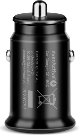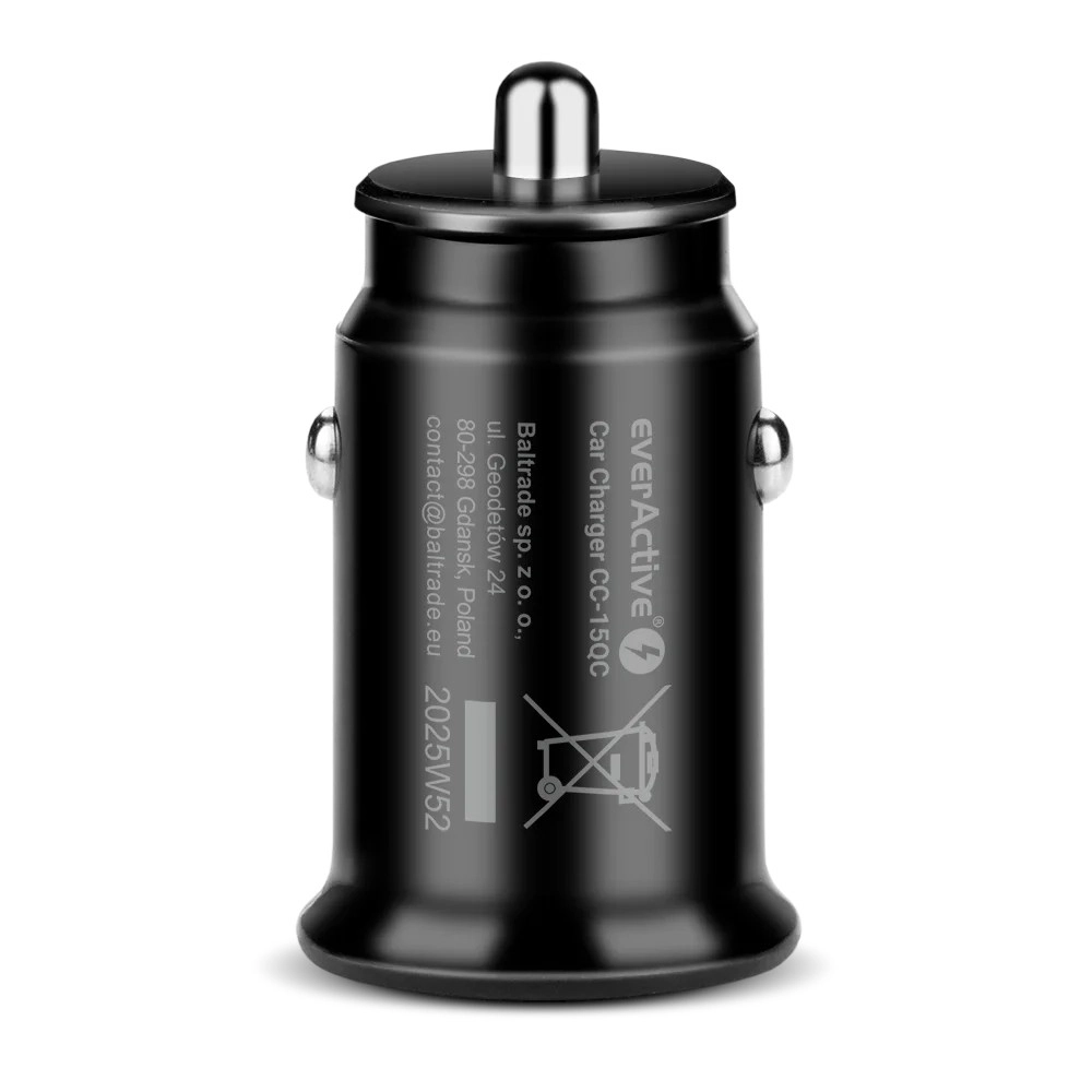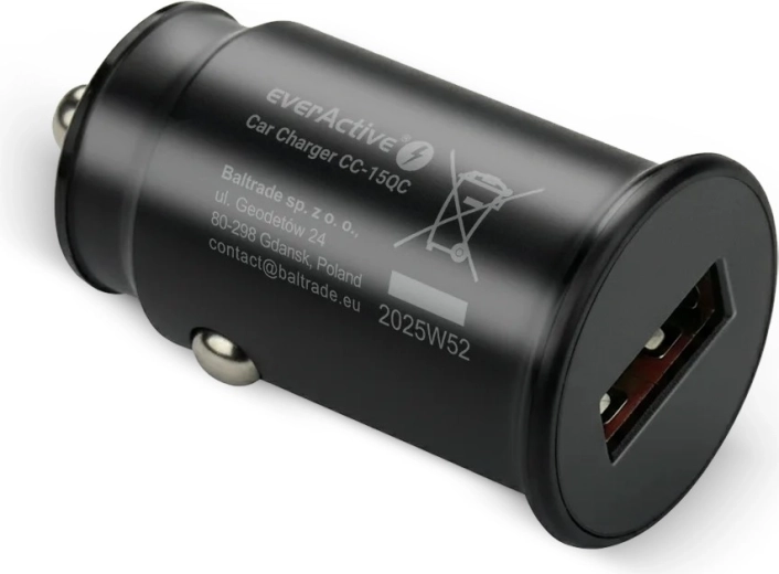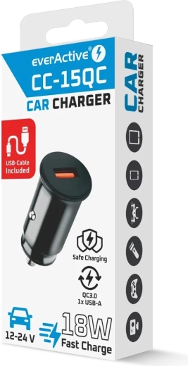 Chargeur voiture compact everActive avec un port USB‑A et la technologie Quick Charge 3.0, offrant une charge rapide et stable jusqu’à 18 W. Grâce à sa large compatibilité, l’électronique intelligente s’adapte automatiquement à votre téléphone, GPS et autres appareils mobiles – idéal pour chaque trajet.