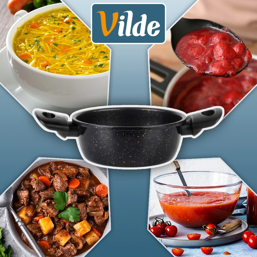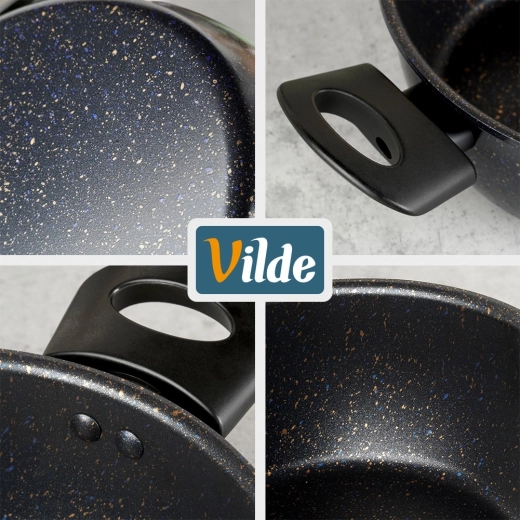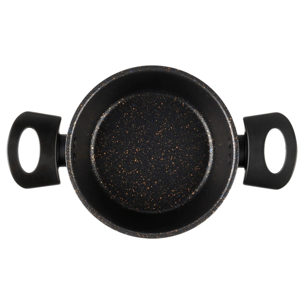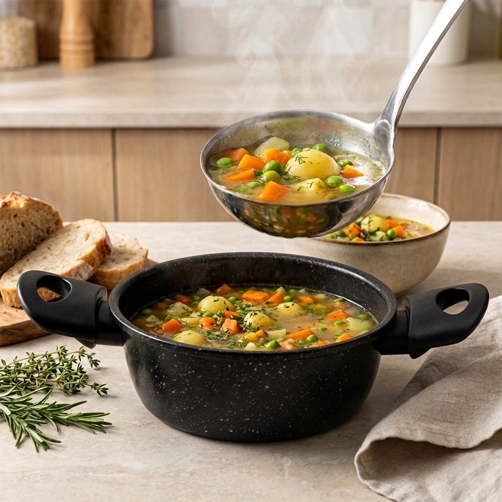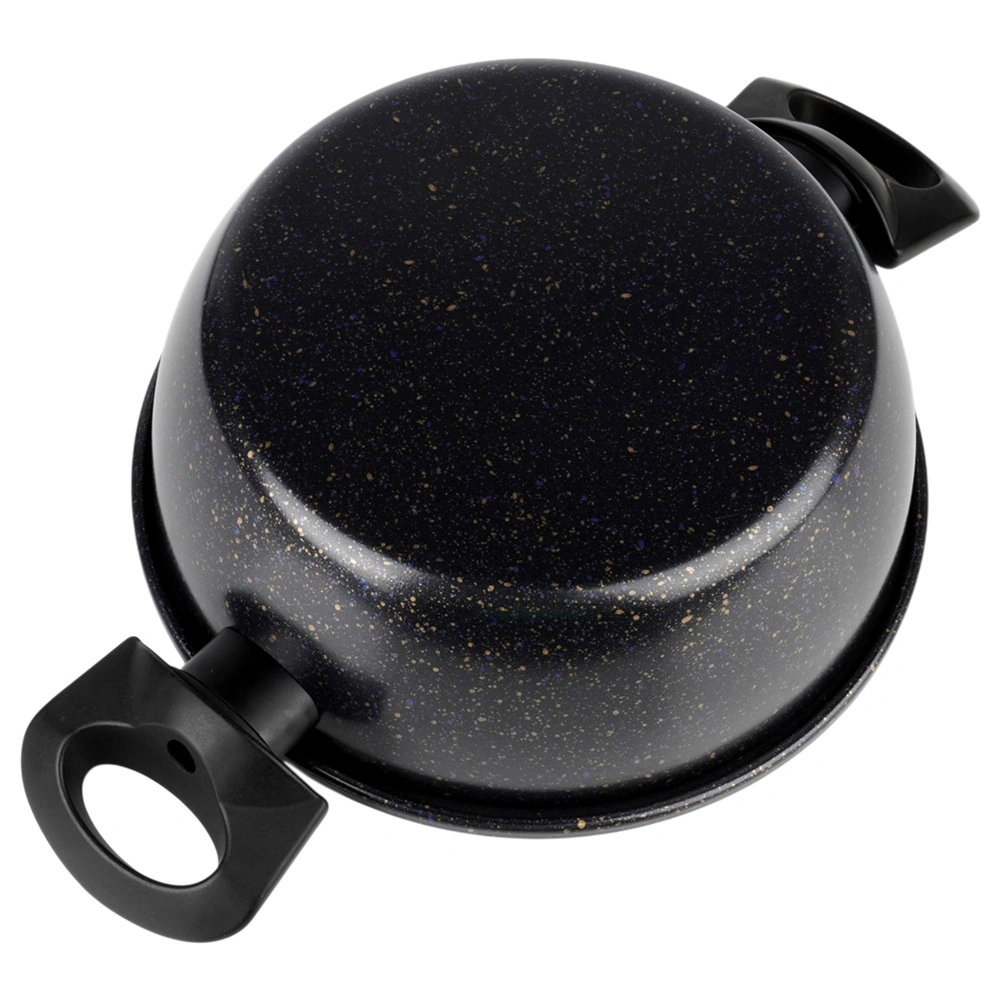 Pratique, la casserole avec revêtement antiadhésif effet granit facilite la préparation des soupes, des sauces et des légumes. Le corps en acier au carbone épais diffuse la chaleur uniformément, tandis que la surface à effet pierre limite l’adhérence et raccourcit le nettoyage. Les poignées latérales ergonomiques en plastique résistant rendent le transfert de la plaque à la table plus agréable.