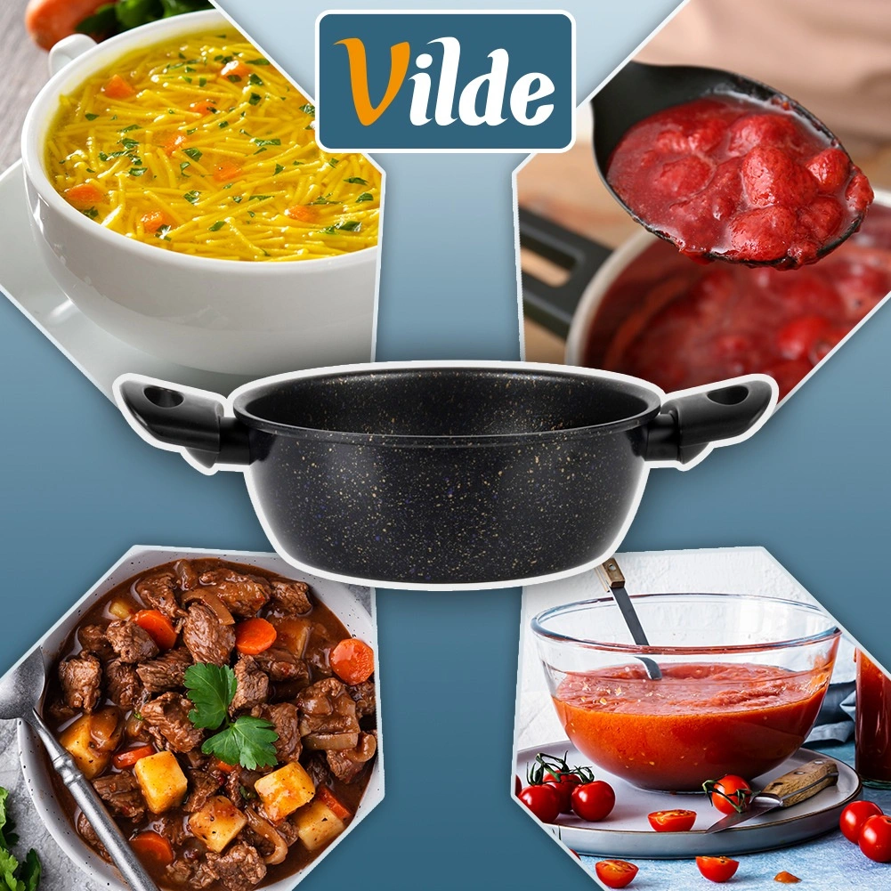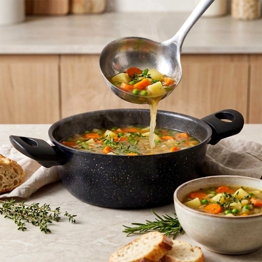 La casserole universelle de la gamme Basic Line est fabriquée en acier au carbone robuste et dotée d’un revêtement granit antiadhésif pour un démoulage facile des aliments et un nettoyage rapide. Idéale pour la cuisson, le mijotage et le réchauffage quotidiens des soupes, sauces, légumes et plats principaux.