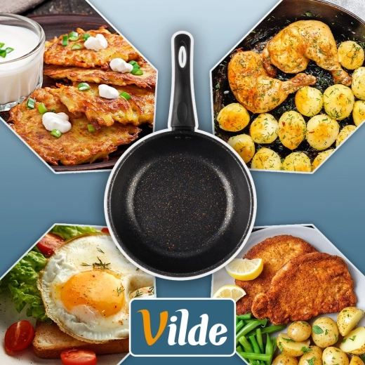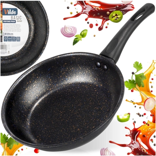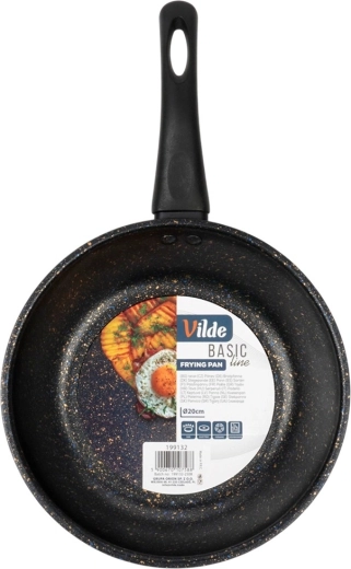 Poêle élégante et résistante de 20 cm de diamètre de la collection VILDE Basic Line, idéale pour la cuisson quotidienne à la poêle et à l’étouffée. Le revêtement granit antiadhésif permet de cuisiner avec un minimum d’huile, les plats n’attachent pas et la poêle se nettoie facilement — y compris au lave-vaisselle.