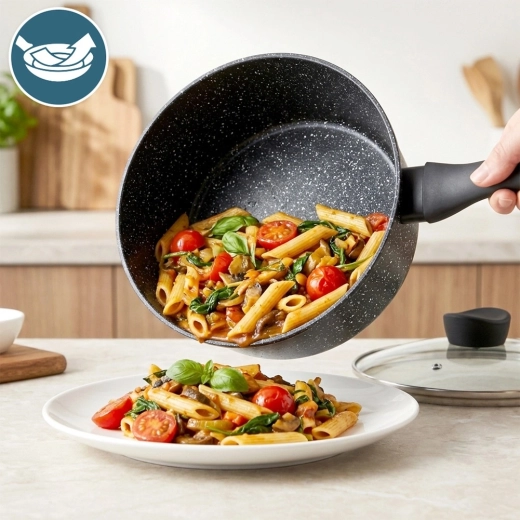 Le revêtement granit multicouche réduit l’adhérence et permet de cuisiner avec moins de matières grasses. Le nettoyage est rapide et sans effort.