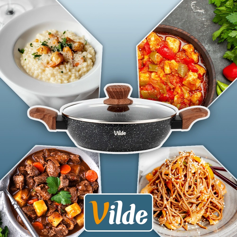 La poêle profonde de 24 cm de diamètre et d’un volume total de 2,2 l est idéale pour préparer goulaschs, sauces, pâtes, légumes et plats « one‑pot ». Le corps robuste en fonte d’aluminium avec revêtement granit antiadhésif permet de cuisiner avec un minimum d’huile et sans accrocher, tandis que le couvercle en verre avec bord en inox et valve retient la chaleur et les arômes à l’intérieur.