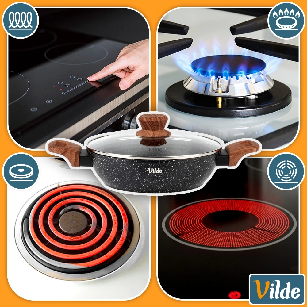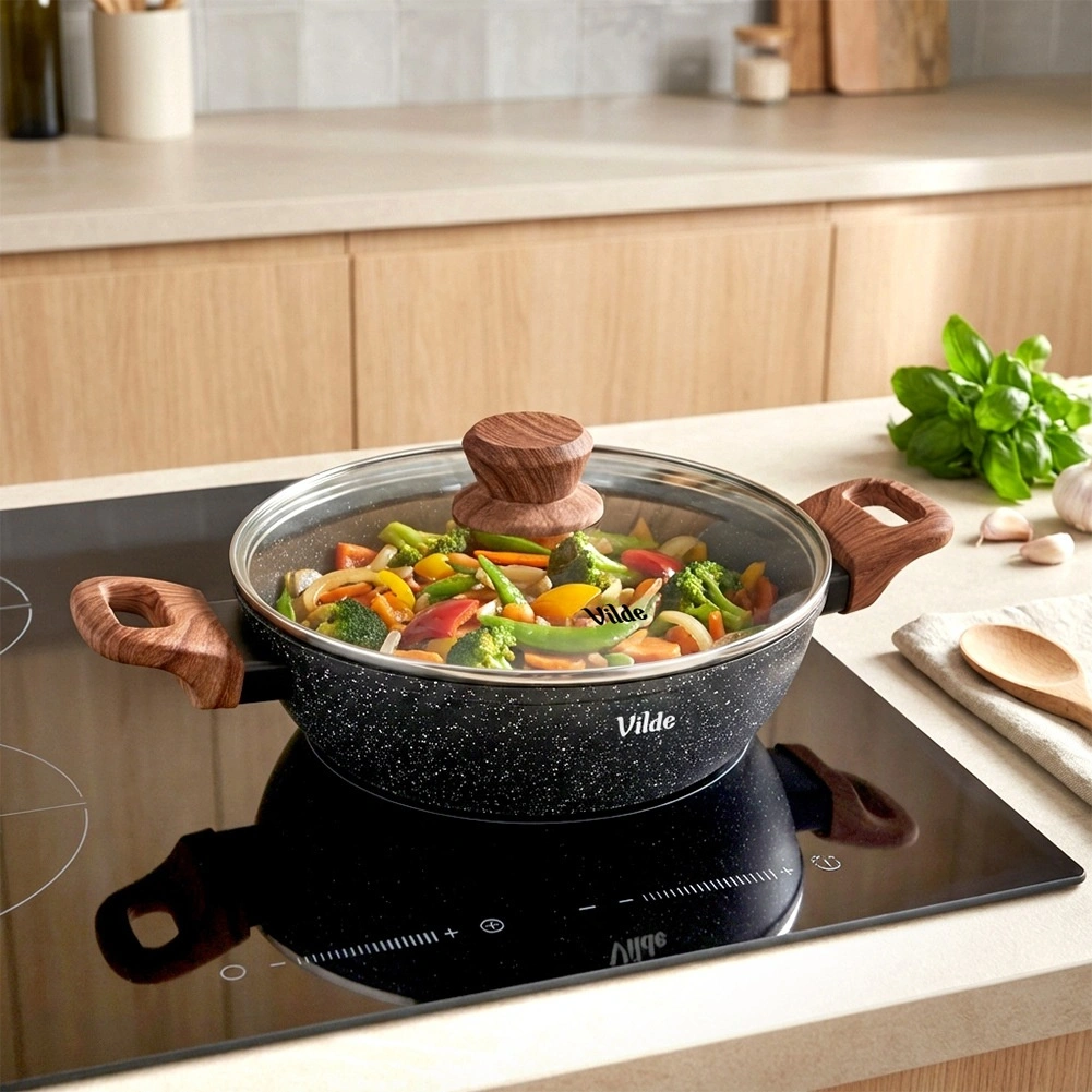 Les poignées soft touch aspect bois ergonomiques offrent une prise ferme et confortable lors du transport. La poêle est compatible avec tous les types de tables de cuisson, y compris l’induction, et pour un entretien facile, elle passe au lave‑vaisselle.