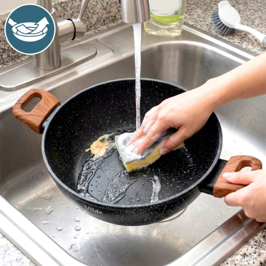 Grâce à deux larges poignées soft-touch au décor bois, vous bénéficiez d’une prise en main sûre et confortable lors du transport et du service directement à table. La poêle convient aux plaques à induction, au gaz, électriques et vitrocéramiques et peut être lavée au lave-vaisselle.