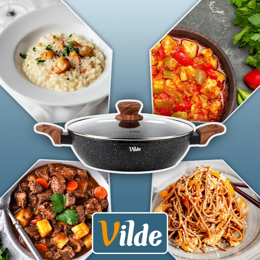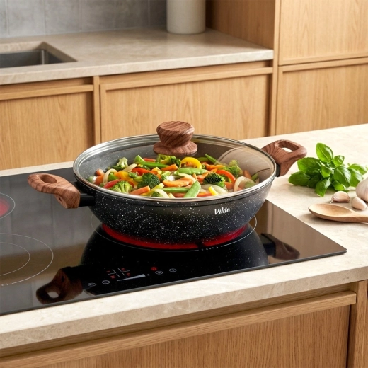 La poêle profonde Vilde de la ligne Granitica Wood est un assistant polyvalent pour frire, mijoter et gratiner. Le corps en aluminium moulé robuste avec une couche en granit antiadhésive assure une répartition uniforme de la chaleur et un démoulage facile des aliments sans attacher. Le couvercle en verre transparent avec valve vapeur permet de contrôler la cuisson sans soulever le couvercle.