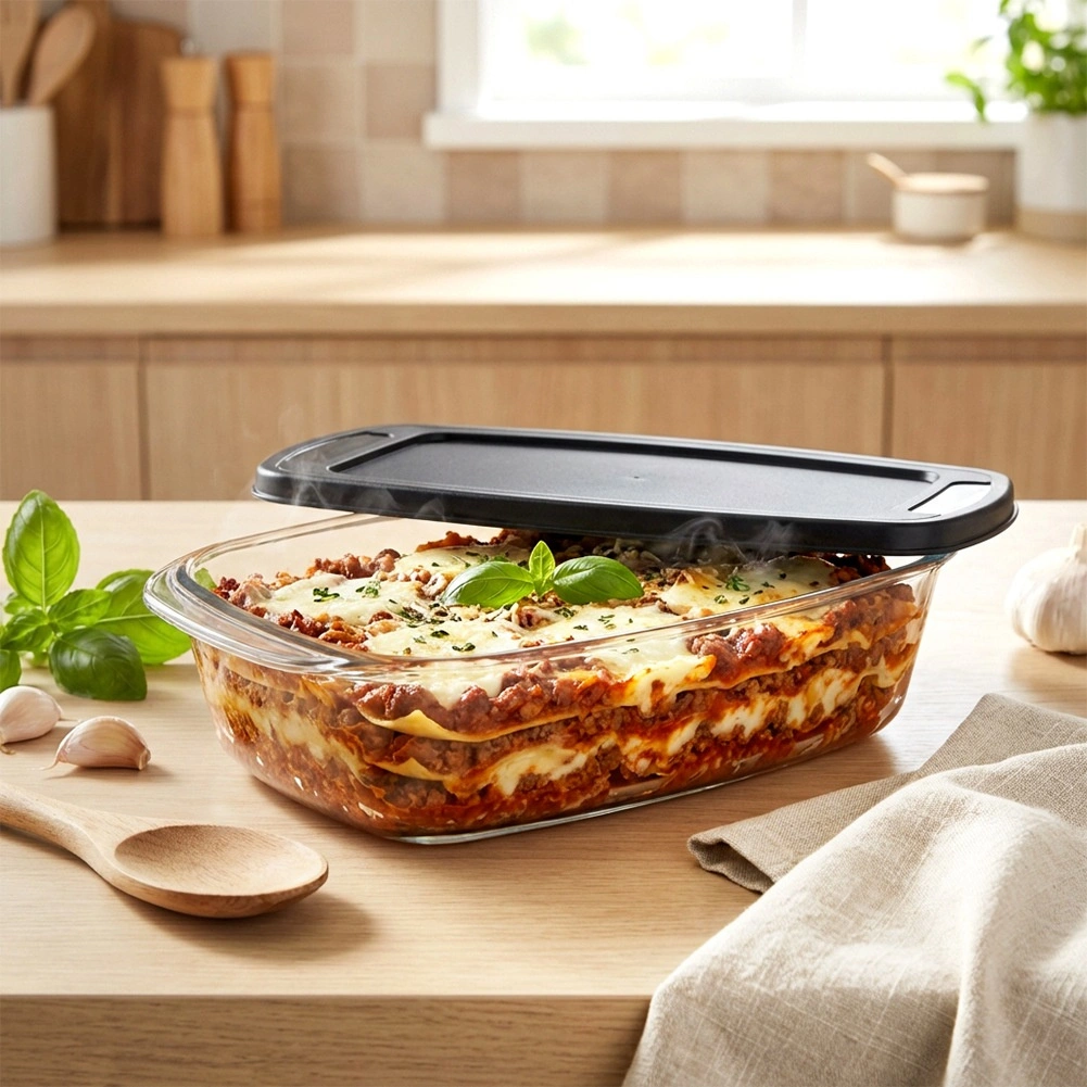 Ce plat en verre résistant à la chaleur avec couvercle se distingue par sa grande durabilité, sa polyvalence et son élégance, vous permettant de préparer et de servir facilement vos plats préférés directement à table. Le verre borosilicate est particulièrement solide et résistant aux chocs thermiques lorsqu’il est utilisé correctement.