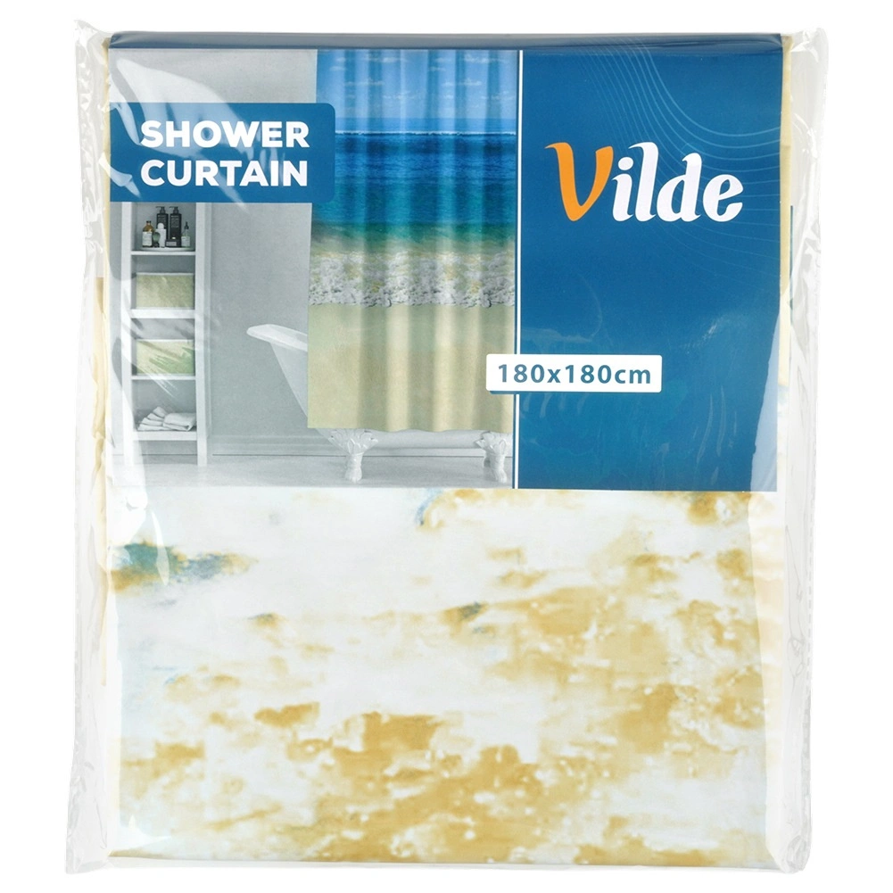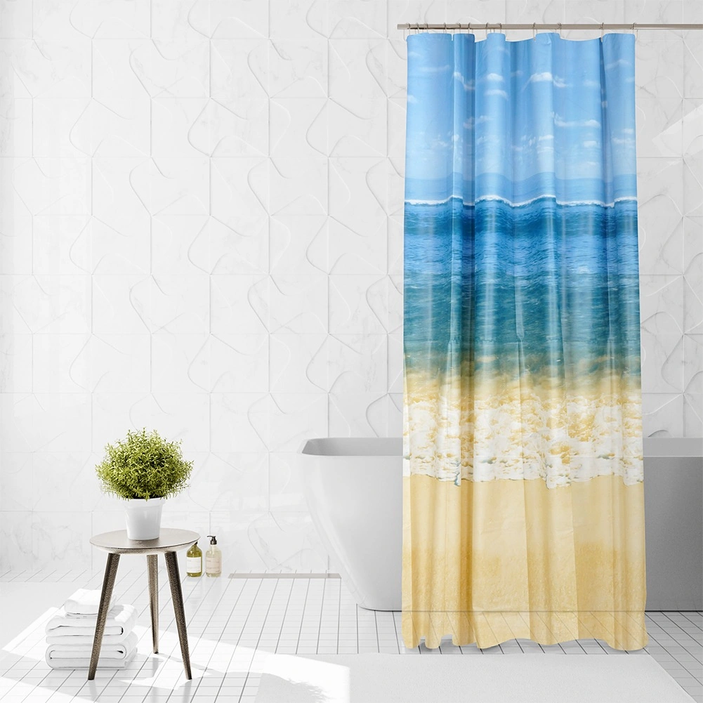Rideau de douche élégant au motif de plage, dimensions 180 × 180 cm, livré avec 12 crochets. Fabriqué en matériau écologique PEVA, il est imperméable, facile à nettoyer et offre intimité et protection fiable contre les éclaboussures d’eau pour la plupart des baignoires et cabines de douche.
