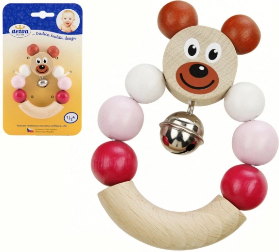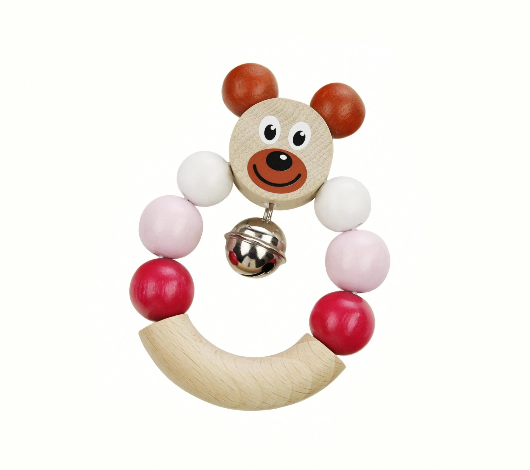Adorable hochet en bois avec petit ours de couleur rose qui fera plaisir à chaque bébé. Une clochette intégrée tinte délicatement, le hochet est très léger et grâce à ses dimensions compactes 7 × 9 cm, il tient parfaitement dans les petites mains. Le produit répond aux exigences strictes de l’UE en matière de sécurité des jouets et arbore le certificat Jouets sûrs.