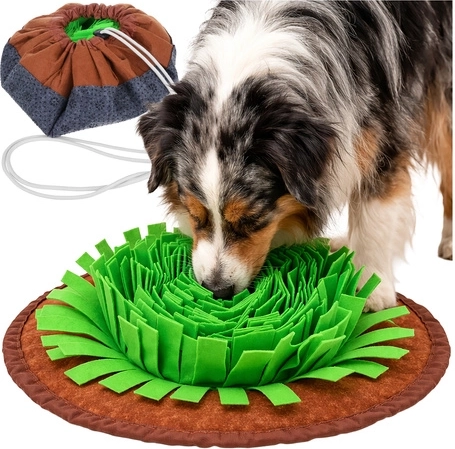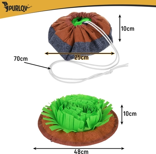 Offrez à votre chien un repas au calme et un jeu en un. Le tapis de fouille PURLOV, avec ses denses «feuilles» textiles, dissimule croquettes et friandises pour que le chien utilise son flair plutôt que d’engloutir. Grâce au cordon de serrage, il est réglable selon la difficulté, possède une base antidérapante pour plus de stabilité et se lave facilement pour une hygiène quotidienne.