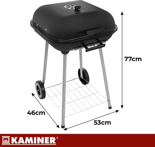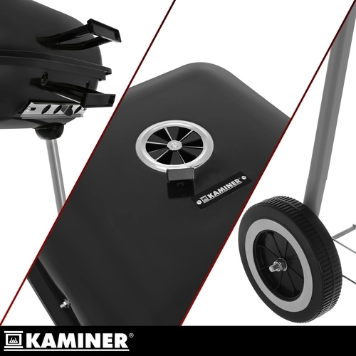 Profitez de steaks parfumés, de burgers juteux et de légumes croustillants avec le barbecue KAMINER. Sa construction robuste, son couvercle émaillé de 1 mm et sa ventilation réglable sur le couvercle et la cuve garantissent une température stable et une cuisson uniforme. Grâce aux deux roulettes et aux poignées latérales/avant, vous déplacez facilement le barbecue exactement où vous souhaitez griller.