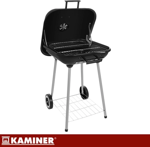 Le barbecue de jardin KAMINER compact et mobile avec couvercle offre une cuisson plus rapide et plus homogène, une meilleure rétention de la chaleur grâce au couvercle émaillé de 1 mm et un déplacement facile sur roulettes. La grille chromée de 43,5 × 38,5 cm supporte jusqu’à 3,4 kg de viande, les arrivées d’air réglables facilitent un contrôle précis de la braise et l’étagère inférieure offre un espace de rangement pratique pour le charbon et les accessoires.