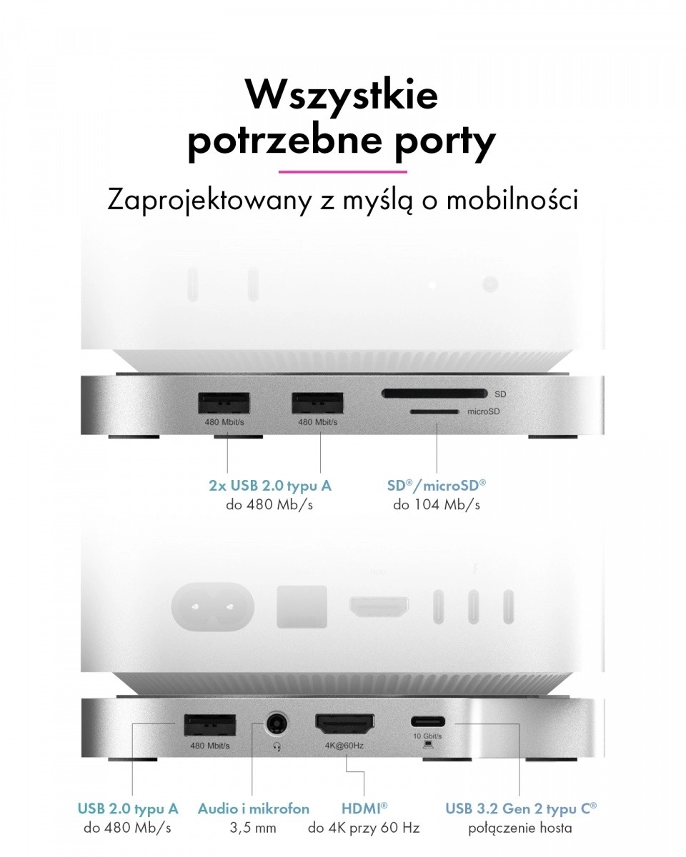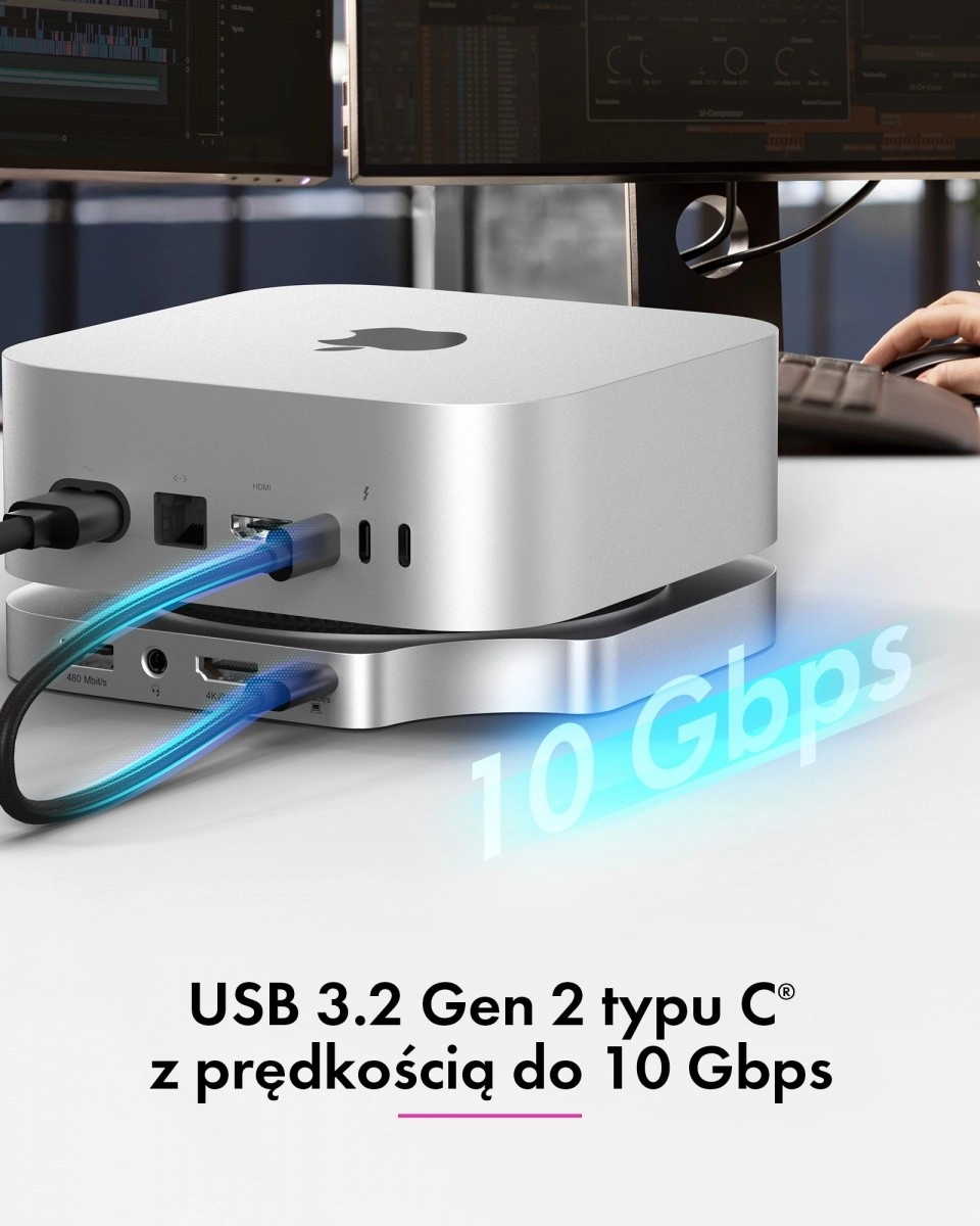 La station d’accueil s’aligne parfaitement sur le style, les dimensions et la palette du Mac mini M4, donnant l’impression d’en faire partie intégrante. Elle organise l’espace de travail, améliore l’ergonomie et rend les ports fréquemment utilisés accessibles directement en façade — rapidement, clairement et sans adaptateurs.