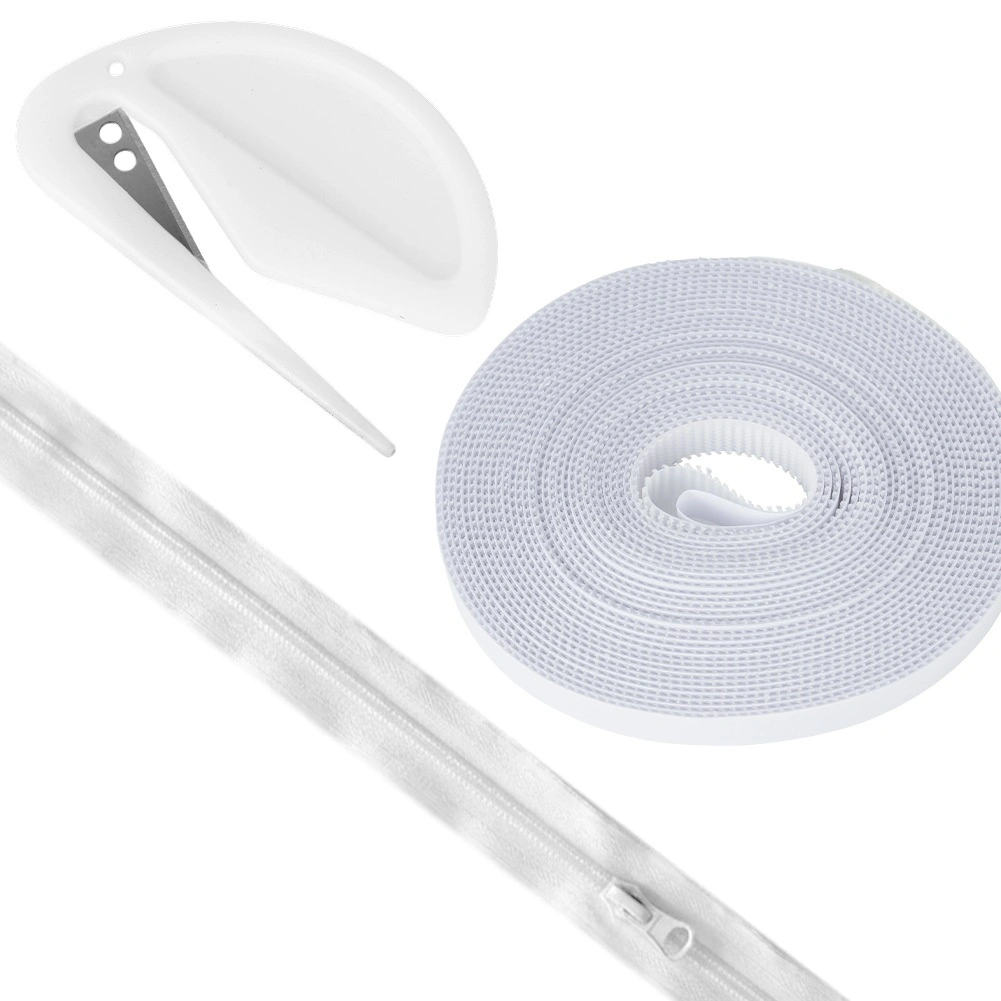 - Moustiquaire, bande autocollante (scratch), bande zippée, outil d’installation