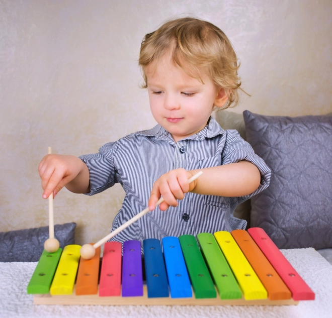 Nous présentons le xylophone en bois coloré de la marque Bino, idéal pour les enfants grâce à sa fabrication de qualité. Avec 12 tons et des maillets en bois fournis, votre enfant peut produire les bonnes notes, car les lames du xylophone sont légèrement entaillées sur la face inférieure :