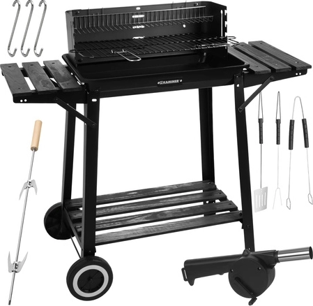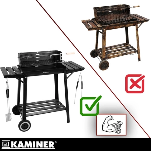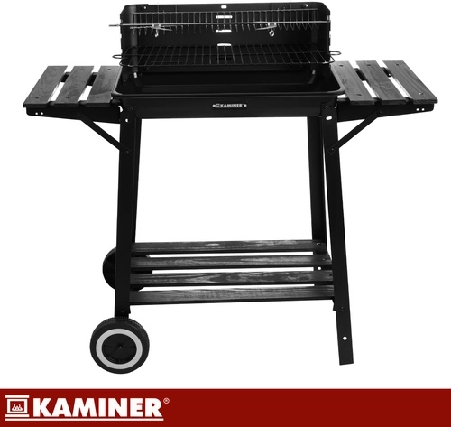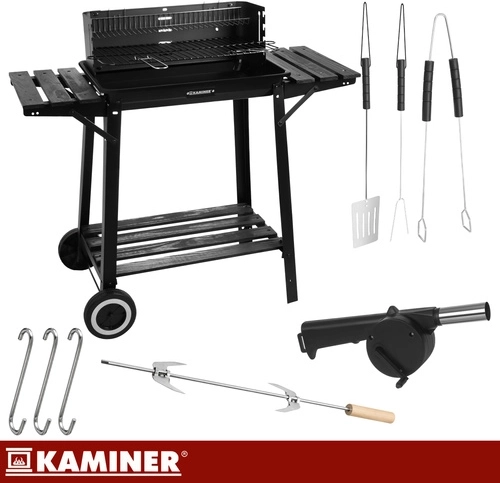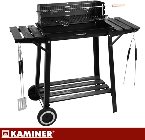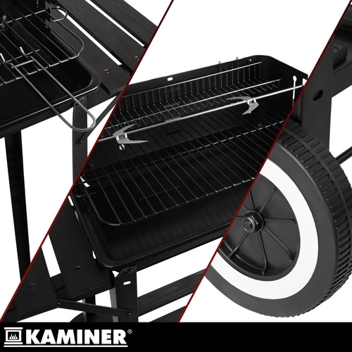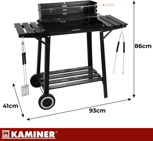 Le barbecue de jardin KAMINER, stable et portable, propose une grille principale chromée, une grille supérieure de maintien au chaud et une broche avec fourche pour une cuisson uniforme. Grâce aux étagères de rangement, aux crochets pour ustensiles et aux roues pour un déplacement facile, profitez d’un gril pratique et d’un nettoyage rapide.