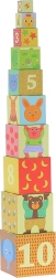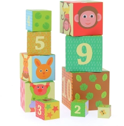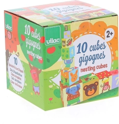 Cette tour à emboîter colorée de la marque VILAC comprend 10 solides cubes en carton avec des faces numérotées et des illustrations d’animaux. Les enfants peuvent empiler les cubes en une haute tour ou les emboîter, ce qui leur permet d’exercer naturellement le calcul, la comparaison des tailles et l’équilibre.