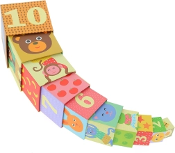 Chaque cube présente les chiffres 1–10, des couleurs et des motifs d’animaux. Les enfants apprennent de façon ludique à compter et à reconnaître les formes et les motifs.
