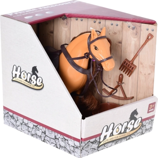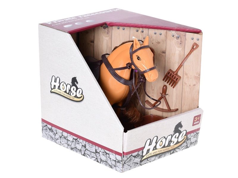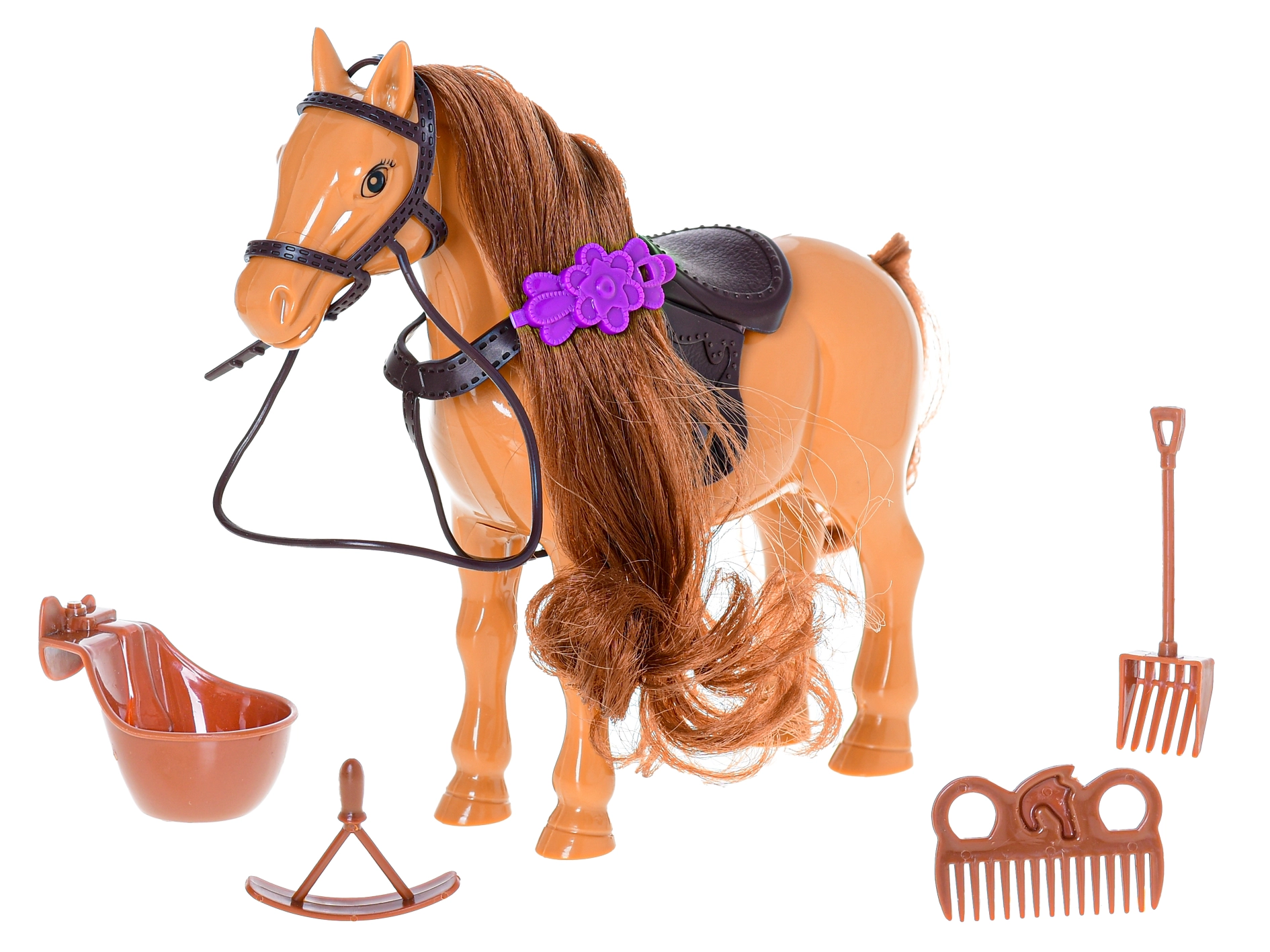 - Cheval avec selle et harnais, seau à eau, fourche, peigne, raclette, décoration de crinière, petit support