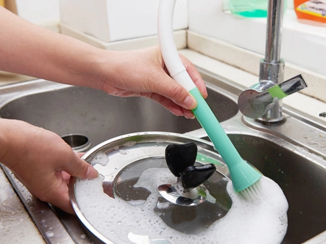 Un embout pratique avec brosse pour robinet qui facilite le nettoyage quotidien de la cuisine. Grâce à sa tête en silicone flexible, il s’adapte à la plupart des robinets et permet de récurer efficacement les casseroles, poêles et couvercles. Les poils denses viennent à bout des saletés tenaces et atteignent même les endroits difficiles d’accès.